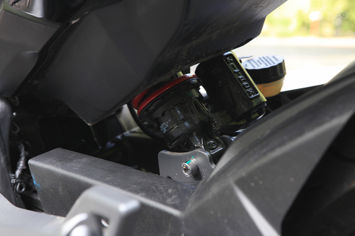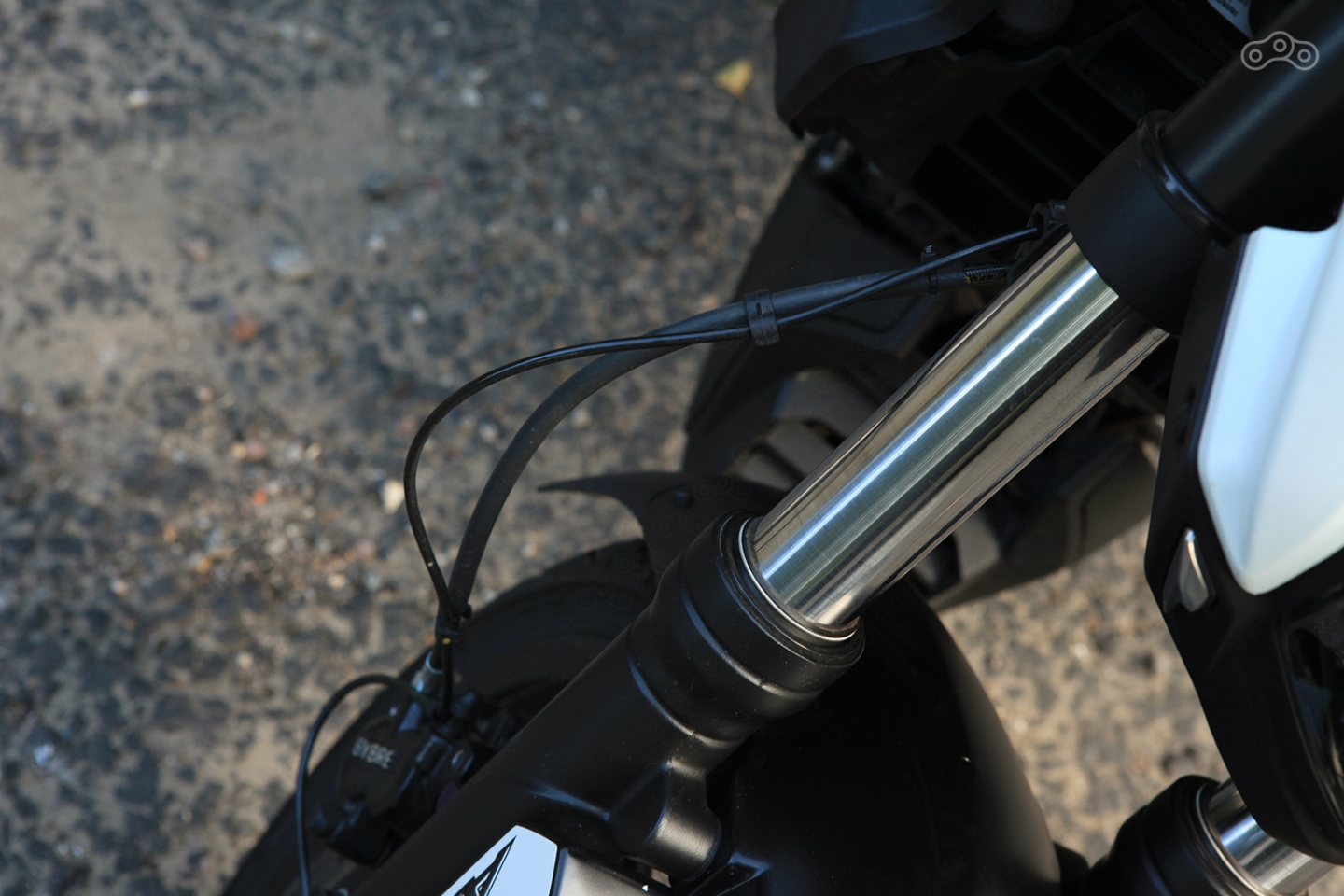 А нужна ли она здесь? Штатная двухканальная ABS позволяет забить на неё так же, как и на дубовую резину – дави на рычаг сильнее, случись чего антиблокировка подстрахует. Аналогично и с задним механизмом – в целом тормозная динамика вполне достойная, хотя и не выдающаяся, процентам восьмидесяти потенциальных покупателей её хватит за глаза. А вот чрезмерно длинный передний тормозной шланг и провод датчика АBS, выпирающие вправо не только не эстетичны, но и не очень безопасны.