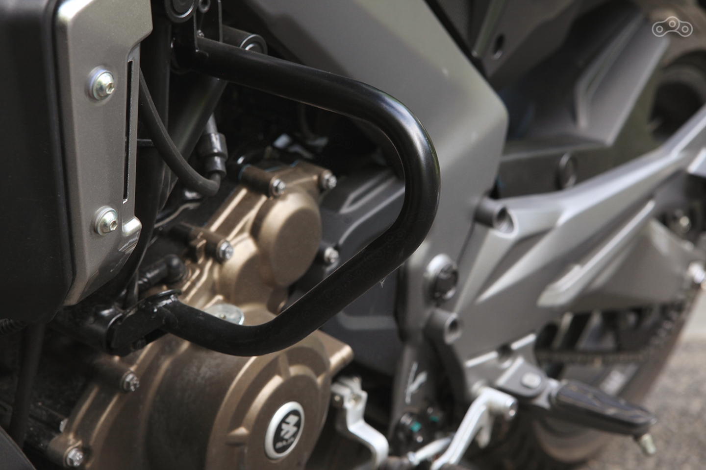Соответствует общей концепции мотоцикла и двигатель, над которым потрудились не только инженеры, но и маркетологи. Про последних мы расскажем чуть позже, а пока – ощущения. Вибраций, по сравнению с Pulsar 200, стало больше, и ощущаются они как на подножках и седле, так и на руле, закрепленном в траверсе через сайлентблоки. Однако, даже в отсечке они не превращаются в противный зуд и по-прежнему не велики для одноцилиндрового мотора.