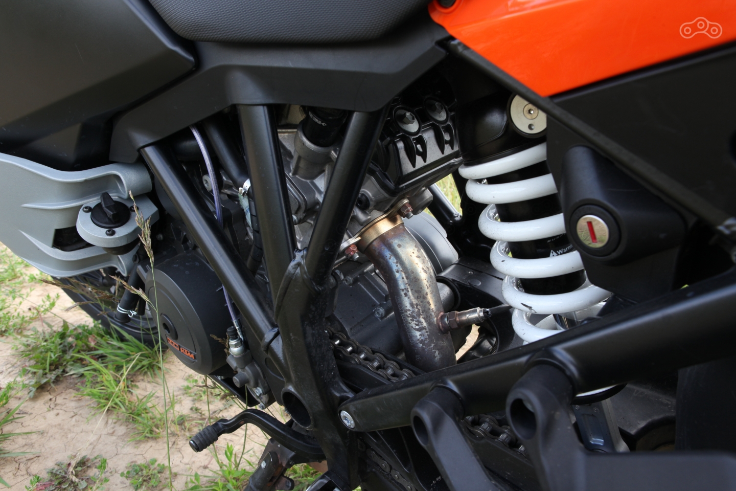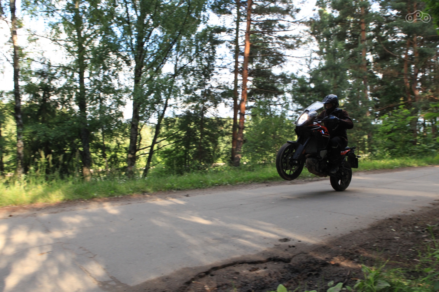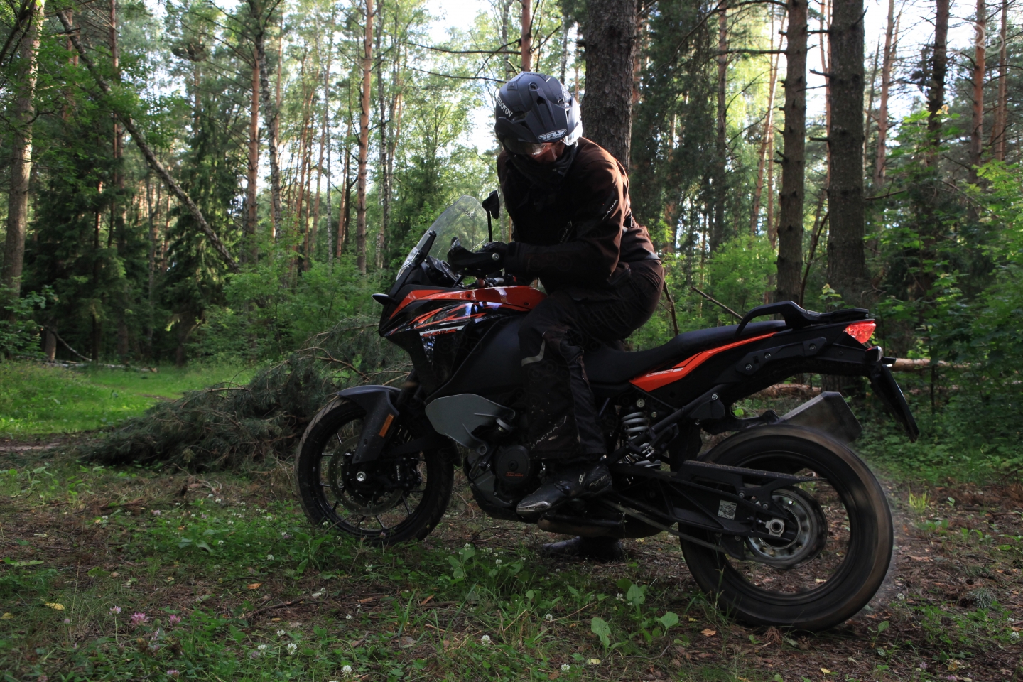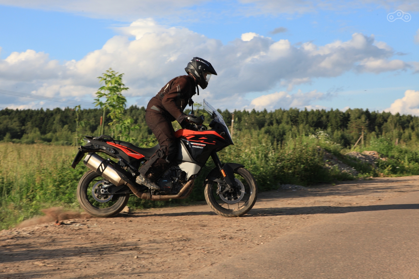 А вот задний амортизатор регулируется как по преднатягу пружины, так и по жёсткости гидравлики, так что его как раз подкрутить можно и приземляться на заднее колесо, тем самым нивелировав мягкость передка. Инженеры КТМ слишком любят быструю езду по пересечёнке, безоружными не оставляют даже бюджетные модели. Именно поэтому 1090 Adventure неплохо ведёт себя как на разбитом асфальте, так и без него, даже на дорожной резине.