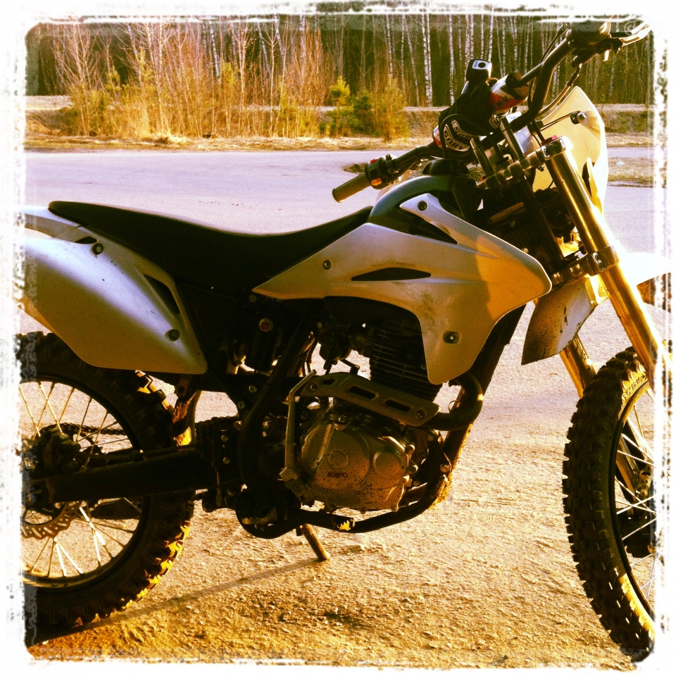 Поначалу у нас с KAYO T2 никак не складывалось, поскольку я умела то, что не умел он, а он умел то, чего пока не умела я. После трех спортбайков подряд пришлось менять все: от экипа до осанки. Руки непривычно не затекали в стоячих пробках при маневрировании медленном, скоростное же пришлось свести на нет, ведь 20,4 лошадиных силенок 105-килограммового аппарата не хватало даже на обгон сторонней коллеги-домохозяйки в Хиундае. О динамичных прошивках транспортного потока и вовсе пришлось забыть, потому что даже самая захудалая кастрюля на асфальте раскочегаривалась быстрее моей чахотки. Междурядье перестало быть таким же комфортным, как на спортбайке: расположенный на уровне зеркал сторонних машин широкий руль наводил тоску по низким клипонам и первое время с непривычки заставлял вспоминать унизительные слова извинений первосезонника за неумелое просачивание в особо узких местах. Но время лечит. И вскоре “лекарственной” болгаркой ширина руля была изменена на комфортную. Образовавшаяся по мановению пилы высочайшая маневренность KAYO T2, которую я возможно путаю с легкостью мотоцикла и непревзойденным по сравнению с Yamaha YZF R6 широчайшим (практически наизнанку) углом поворота руля, позволила прокладывать путь жизни без учета шахматного порядка кучкующихся пробочников, регулярно встающих на моем не особо законопослушном пути.