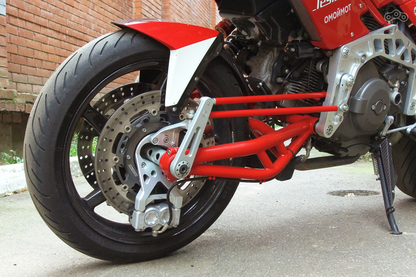 Хозяин нашего мотоцикла занялся куда более правильным тюнингом – заменил штатные легкосплавные колёсные диски карбоновыми, а заодно – воткнул новые моноблочные суппорты, вместо штатных Brembo. Последние, к слову, могли бы стать украшением и гордостью любого мотоцикла, но Bimota заслуживает механизмов поэксклюзивнее, с лучшим охлаждением и меньшей массой. Как говорится, кашу маслом не испортишь.