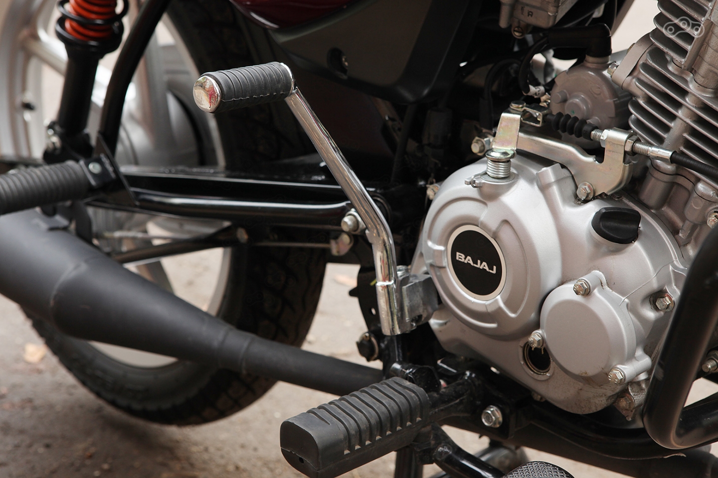 Выкрашенные в яркий цвет двойные амортизаторы, равно как подножки для третьего пассажира – главные фишки Bajaj BM 150