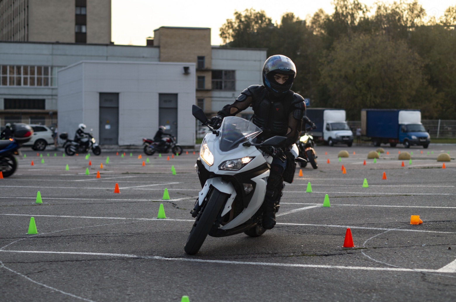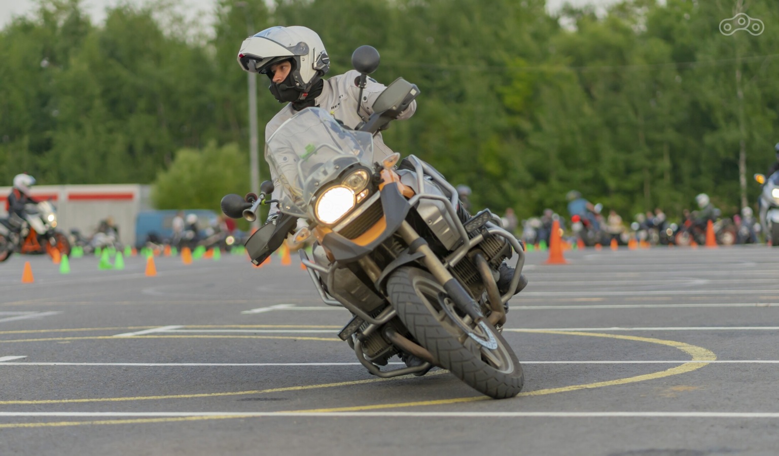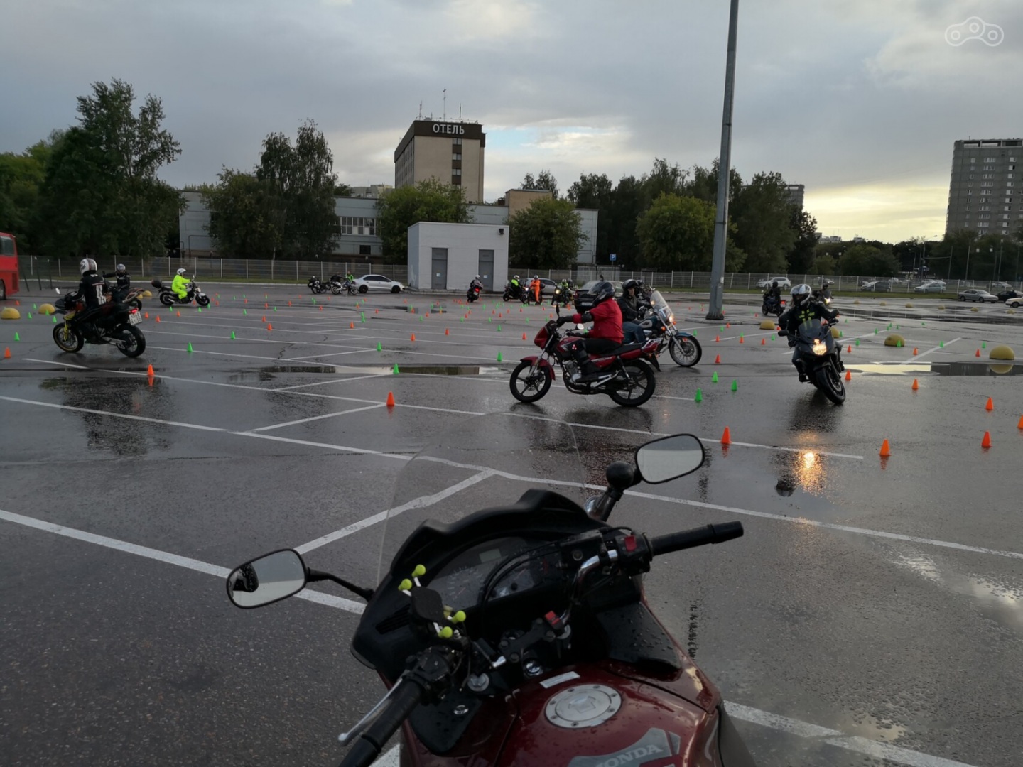 Вы приехали первый раз, мотоциклы мельтешат туда-сюда и всё похоже на дурацкий кардабалет «ну-его-нафиг»? Не пугайтесь, всё не так плохо. Вы видите так потому что смотрите со стороны через десяток дорожек. На большом квадрате площадки трасса уложена как лабиринт с единственным путём, вот и выглядит странно. Посмотрите картинку выше отслеживая 3 мотоцикла от левого нижнего угла и к центру — все они едут вдоль «стен» из конусов разного цвета вдоль которых прочерчены линии. Поэтому «внутри» трассы всё иначе — и проще. Одна сторона всегда размечена оранжевыми конусами, другая — зелёными/синими. Границы трассы либо обозначены мелом, либо следуют парковочной разметке. Заехать на трассу и выехать можно в любом месте, поскольку трасса закольцована, но обычно все предпочитают это делать в одном месте, возле парковки.