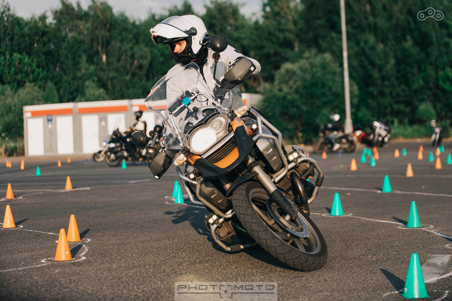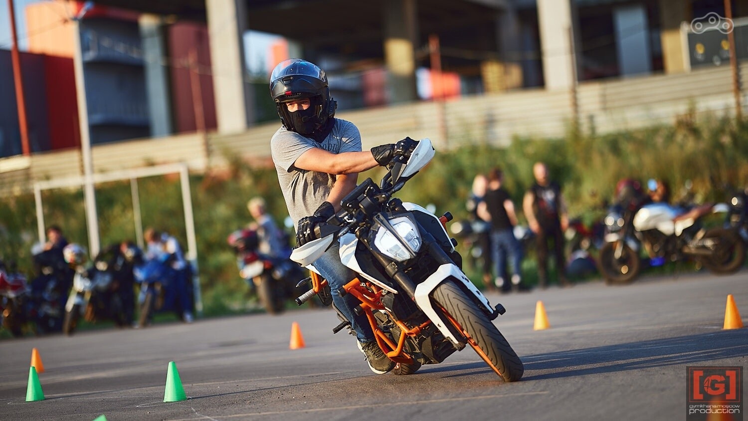 - езжай только в шлеме. Обычно это не надо комментировать, но это означает, что даже если нужно недалеко переставить мотоцикл, надо сделать это в шлеме или перекатить вручную, хотя казалось бы — 20 метров по площадке. Увы, площадка — парковка, на парковку действуют правила, мероприятие согласовано — и это помимо очевидного момента с безопасностью
