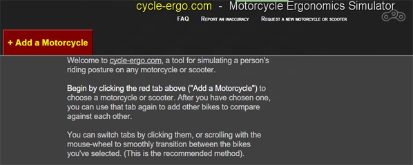 Сегодня я выступлю с несколько необычной темой - хочу поведать о том, как примеряться к мотоциклу, не вставая с дивана компьютерного кресла. Речь пойдёт о сайте cycle-ergo, так что большая часть мотоциклистов могут проходить мимо - вы и без меня знаете его. Но если вы не знаете этот сайт, не знаете английский, хотите примерять байк на себя для покупки или просто посмотреть, как оно - то вперёд!