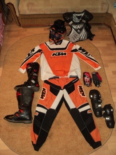 А это уже - защита для мотокросса (не самая лучшая). Ввиду наибольшей частоты падений и ударов, защита мотокроса часто громоздкая и куда более приспособлена для ударов о твёрдые и угловатые предметы. Кроме того, необходимо защищаться и от грязи - для этого существуют наборы одежды (как на картинке рыжая), или отдельные элементы. Хотя если вы не готовы испачкаться, что вам делать на бездорожье?