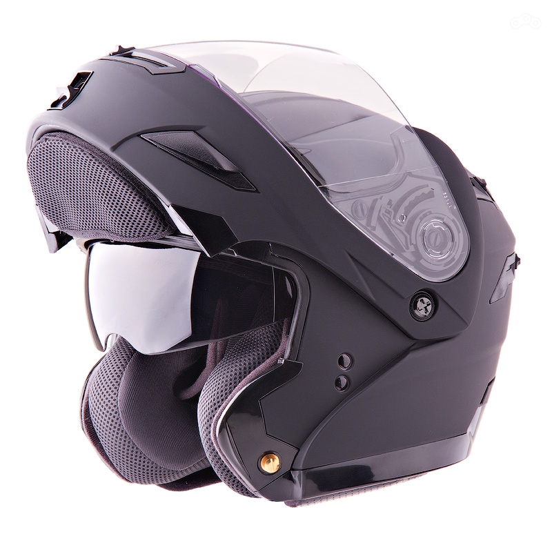 Модуляр - закрытый шлем с откидывающейся нижней челюстью. Считается менее безопасным из-за этого, хотя обычно имеет те же сертификаты об успешном прохождении испытаний, что и интегралы. Зато в путешествии или курильщику он может быть куда более полезен - можно пить, есть, курить не снимая шлем. Чаще экипируется дополнительными опциями (место под гарнитуру, очки и т.п.) чем интеграл.