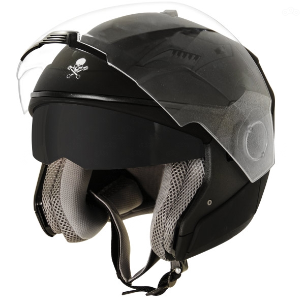Три четверти, он же open face, он же открытый - шлем без подбородка, опционально с большим стеклом. Имеет в целом куда более хороший обзор, однако по статистике около четверти всех возможных и случившихся травм головы приходятся на челюсть. Компромисс между удобством и безопасностью.