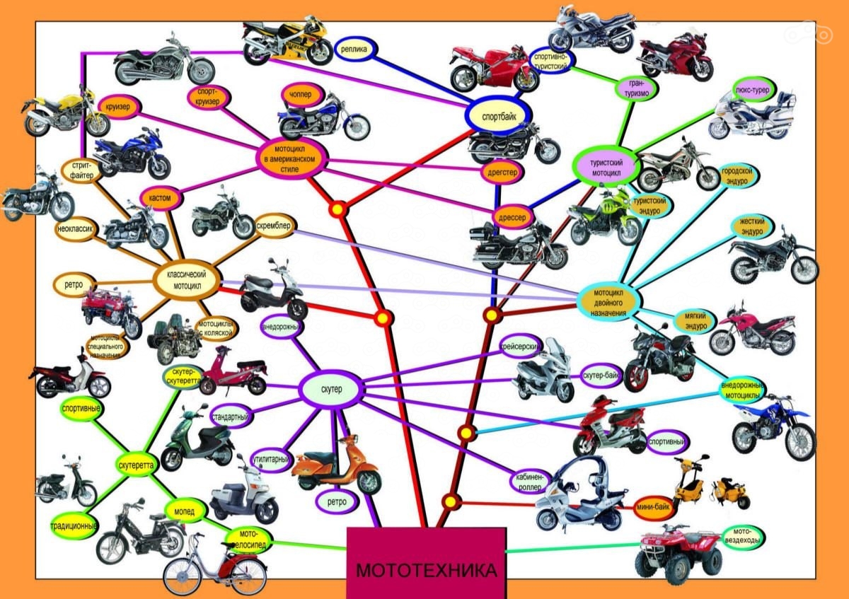 Чтобы ответить на этот вопрос, нам придётся определиться с направлением дальнейших поисков. Для этого я дам ту классификацию, из которой и вырос этот пост. Тут надо понимать, что границы категорий весьма условны и размыты, собственно как и с автомобилями. Более того, мотоциклы имеют столь запутанную классификацию (как мне кажется) в основном от того, что и категории имеют весьма размытые границы, и определений чётких нет. Просто гляньте на этот ужас: