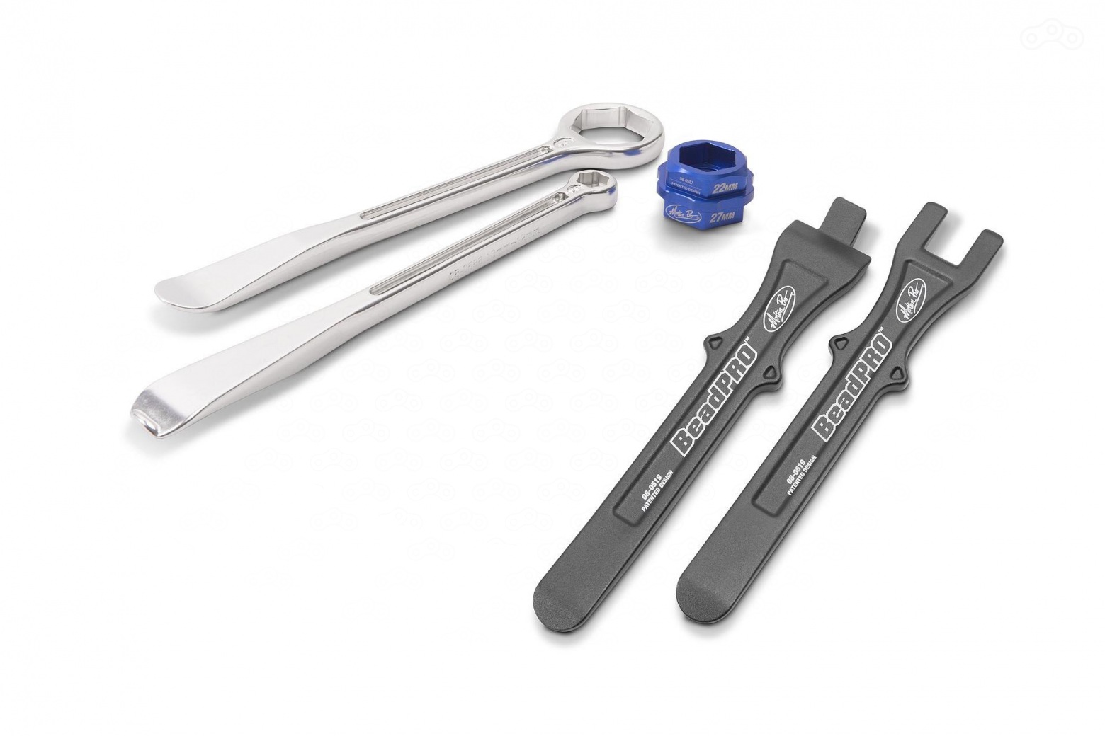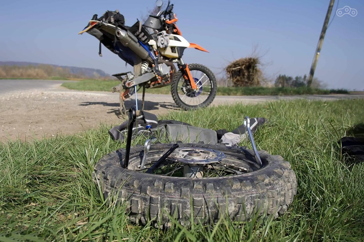 Для демонтажа колёс удобно использовать комбинированные монтажки с гаечным ключом — это избавляет от необходимости таскать с собой трещотку, переходник, тяжёлые головки и отдельные монтировки. А чтобы облегчить отжим борта покрышки от обода, подойдут компактные специализированные монтировки: самый известный пример — Motion Pro BeadPRO. Если вы путешествуете группой, ту же задачу можно решить с помощью боковой подставки мотоцикла товарища.