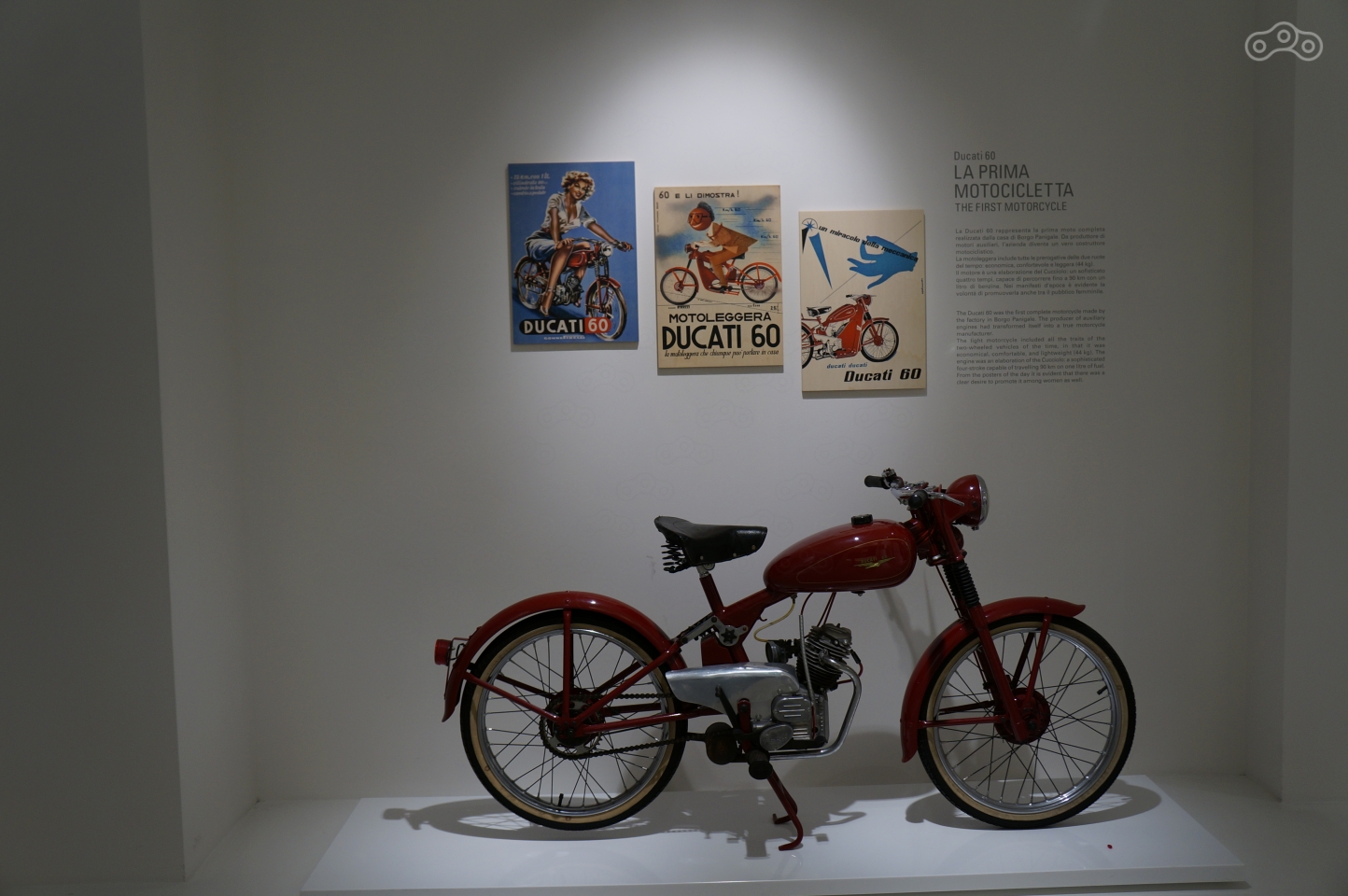 Его, к слову, в музее называют первым мотоциклом бренда, хотя в действительности именно мотоцикл завод выпустил лишь в 1949 году, которым стал 4-тактный одноцилиндровый Ducati 60. Цифра в названии означает объем 2,5-сильного моторчика.
