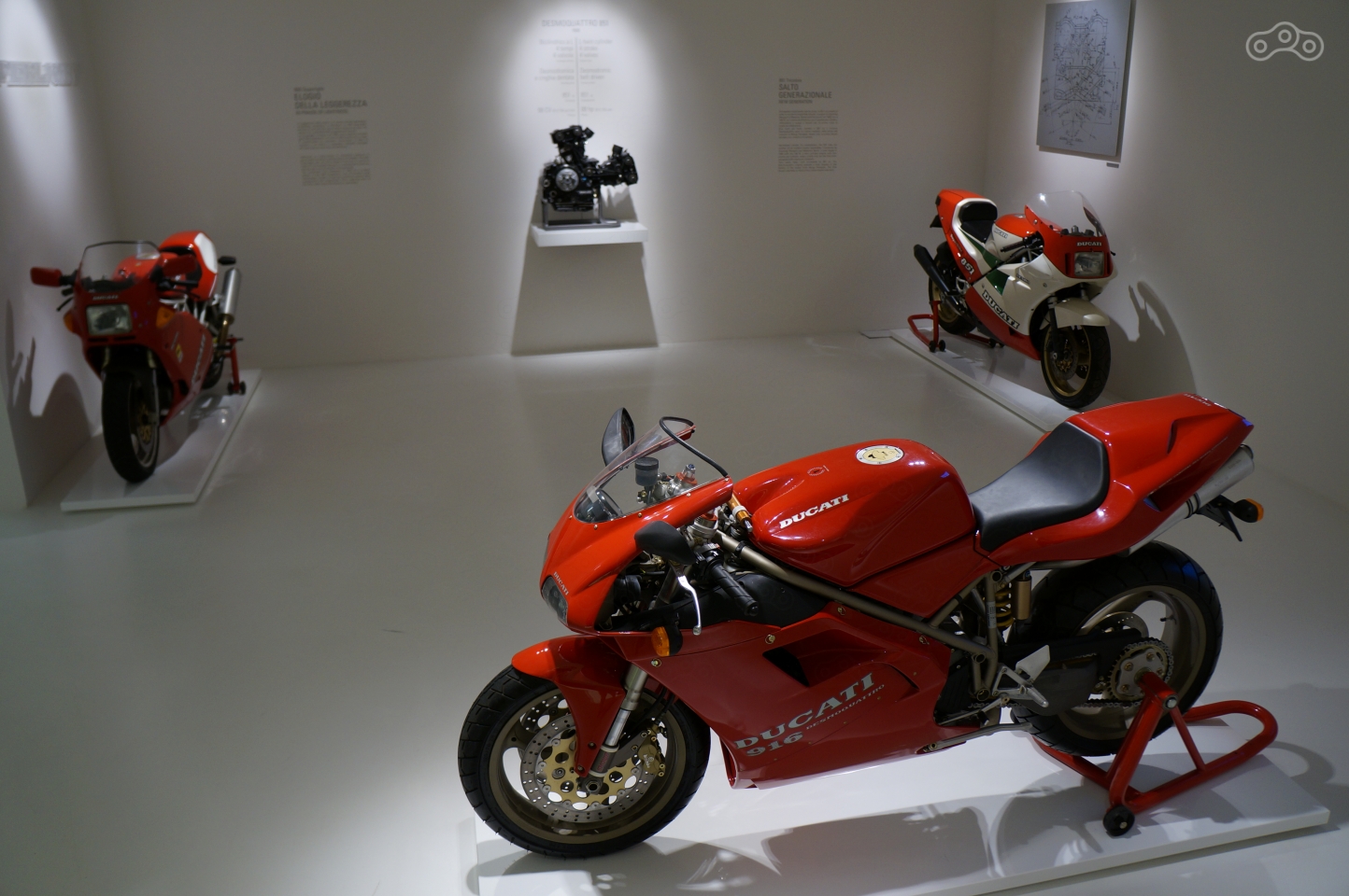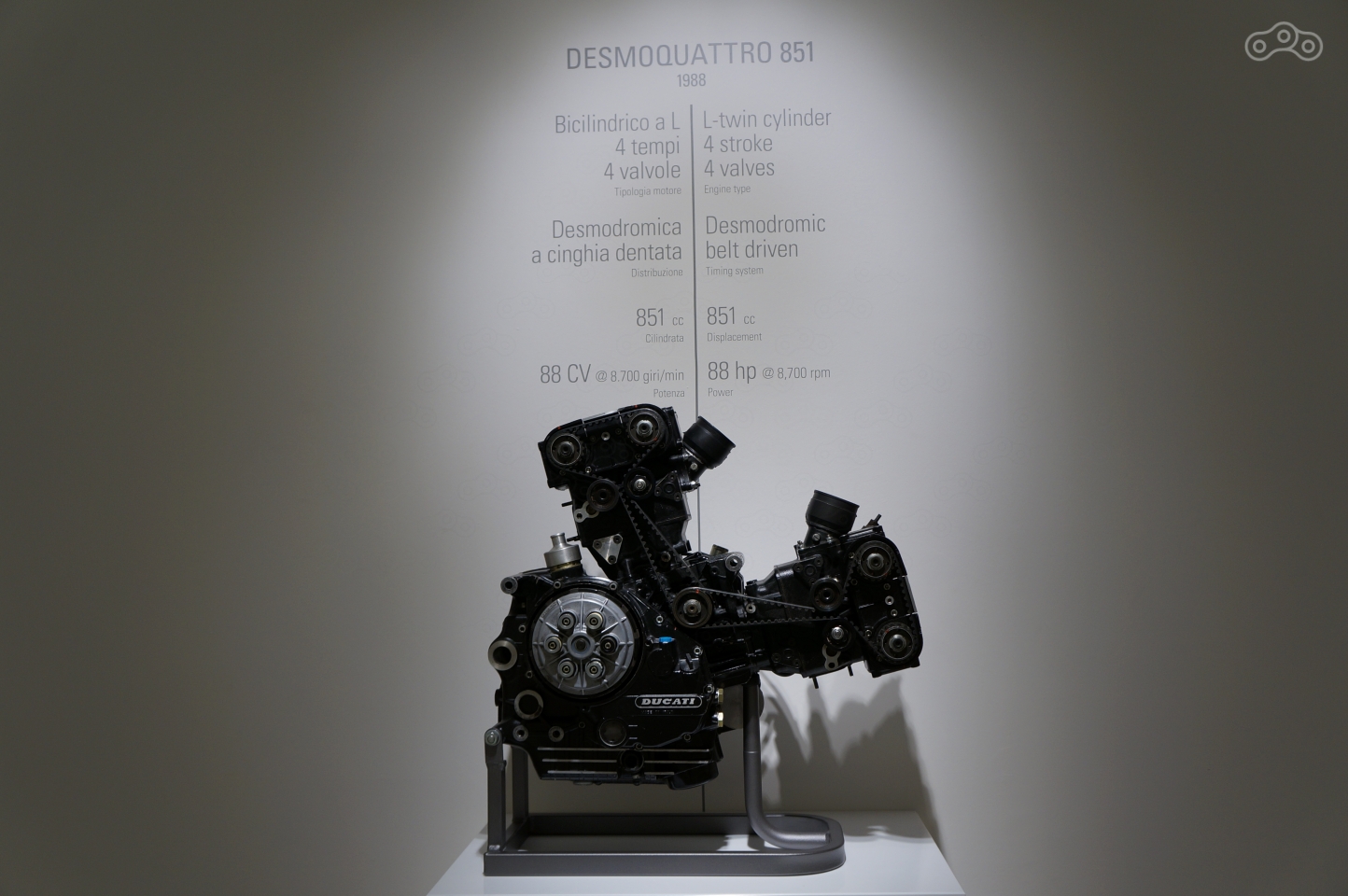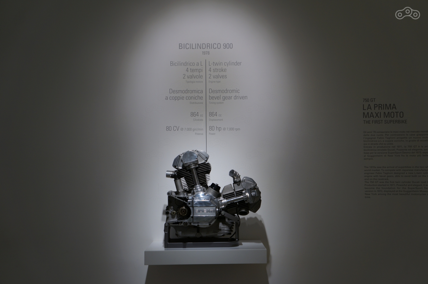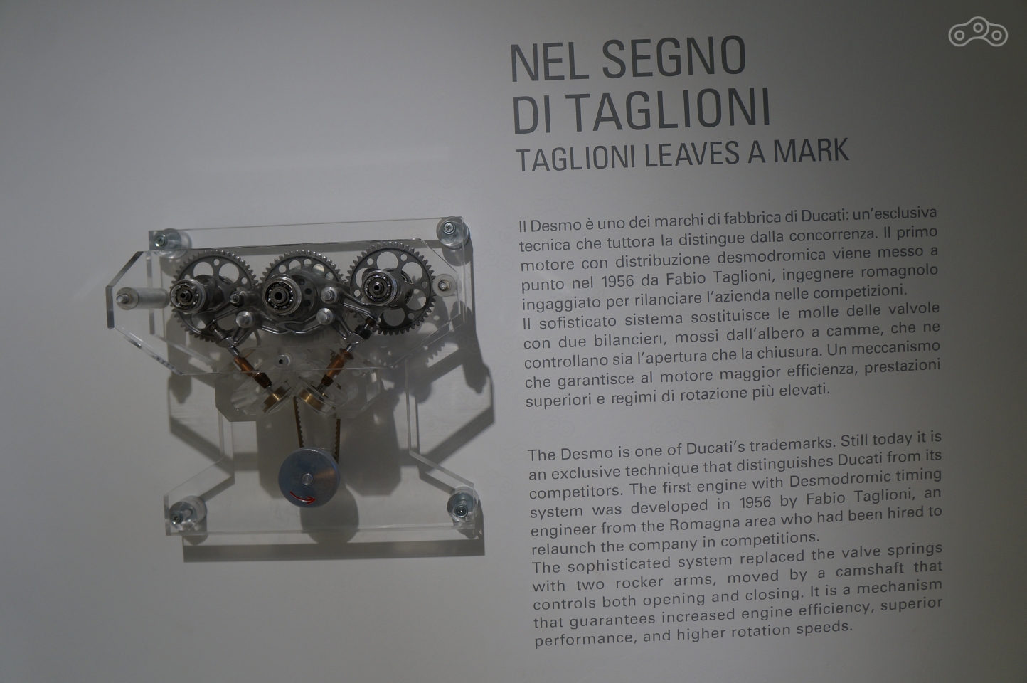 Ему в музее уделено особое внимание – на стене рельеф эквалайзера рева мотора, он же раздается из динамиков, стоит подойти к мотоциклу поближе, а неподалеку – отдельно стоящий мотор и стенд с десмодромным ГРМ в разрезе, который любой желающий может собственноручно покрутить, увидев кинематику коромысел, опускающих и поднимающих клапаны без пружин.