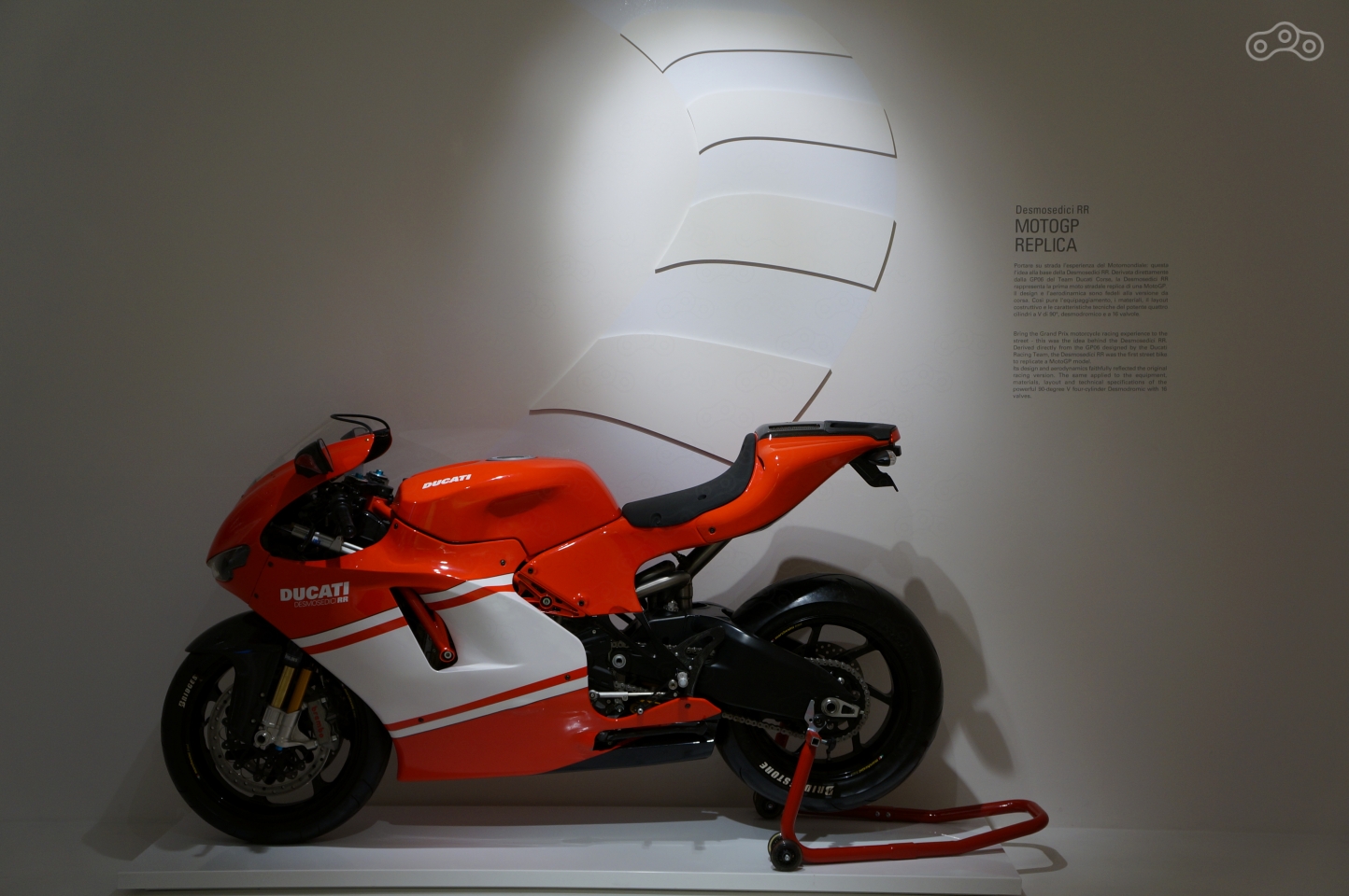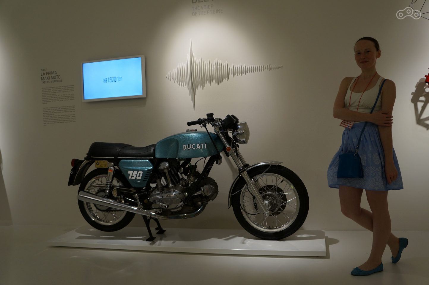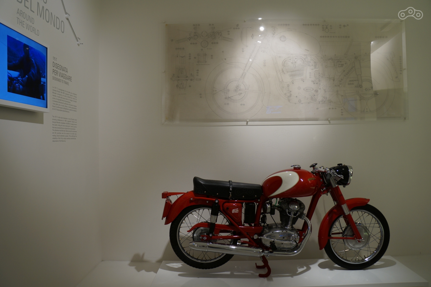 Ему в музее уделено особое внимание – на стене рельеф эквалайзера рева мотора, он же раздается из динамиков, стоит подойти к мотоциклу поближе, а неподалеку – отдельно стоящий мотор и стенд с десмодромным ГРМ в разрезе, который любой желающий может собственноручно покрутить, увидев кинематику коромысел, опускающих и поднимающих клапаны без пружин.
