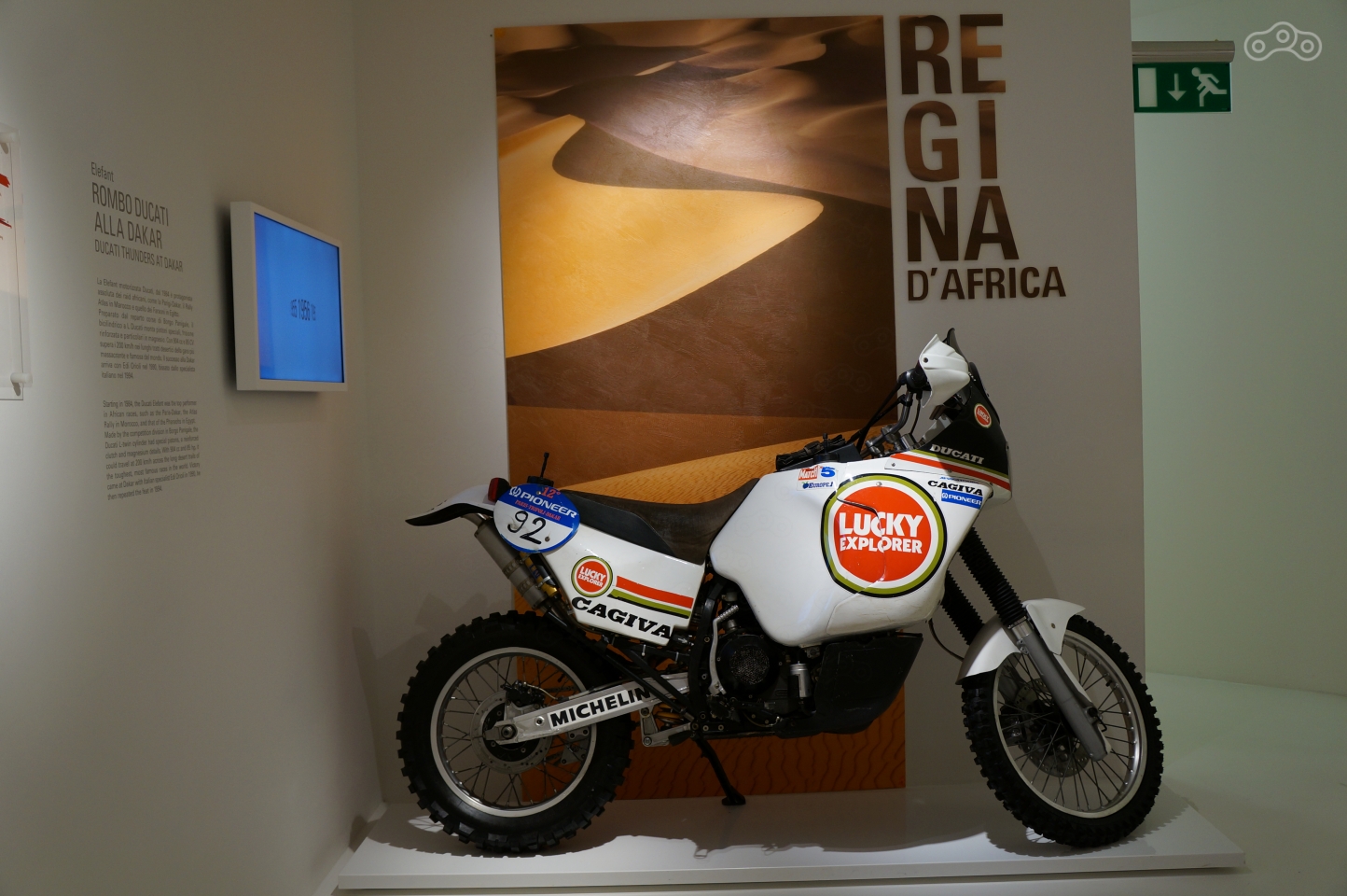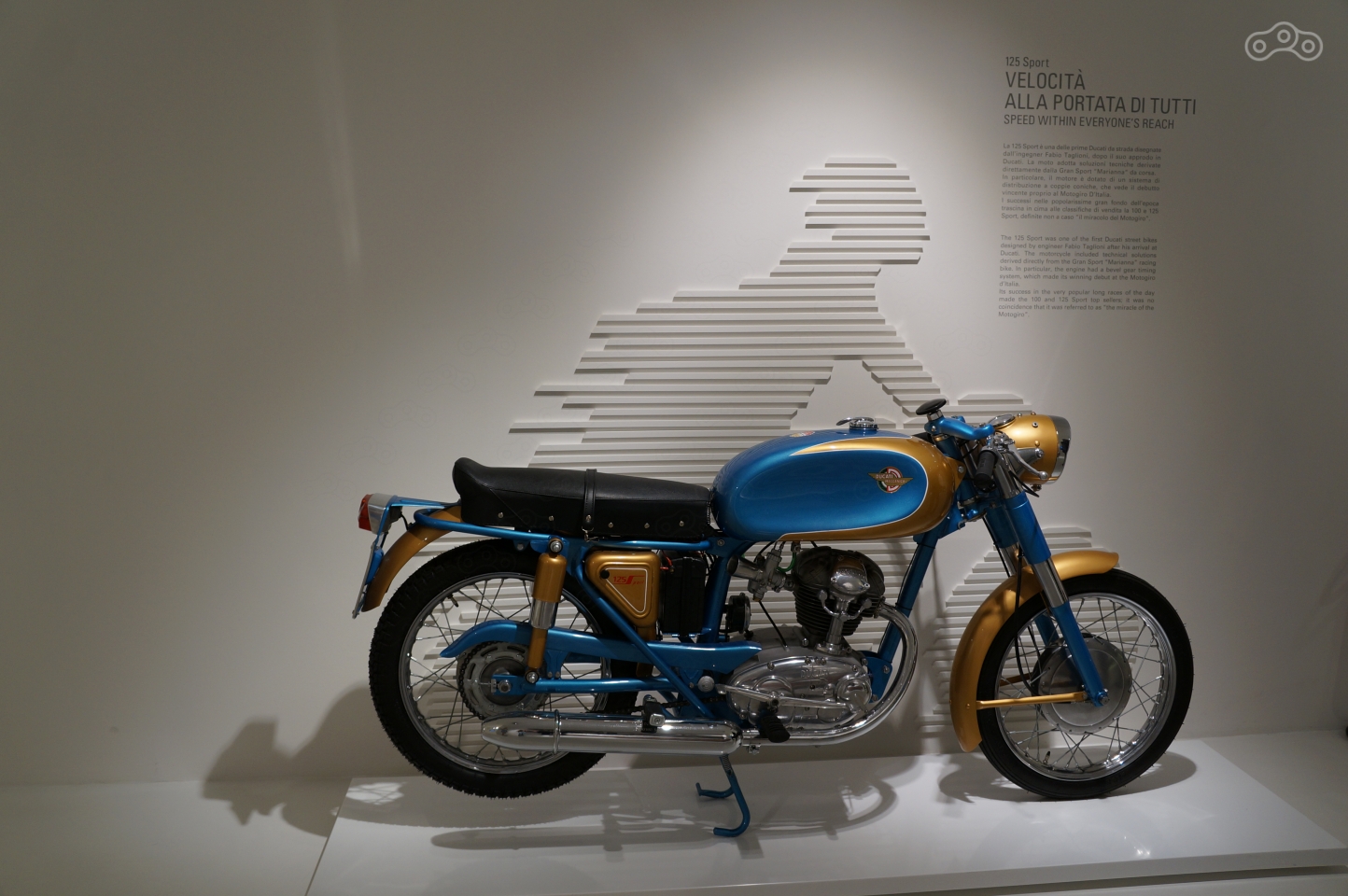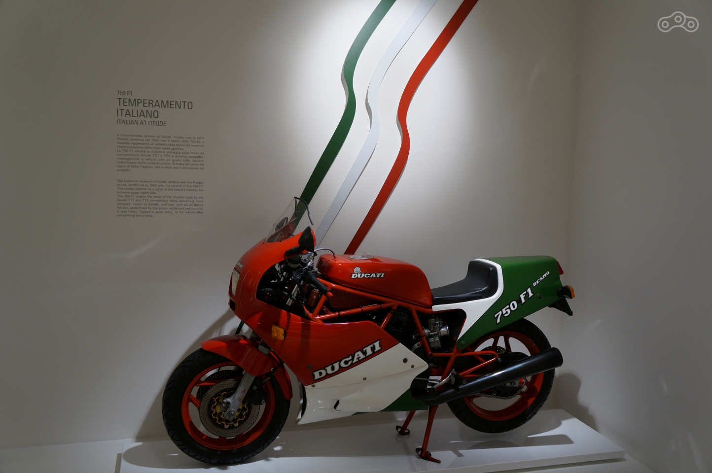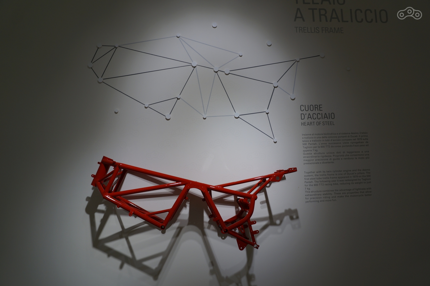 Ему в музее уделено особое внимание – на стене рельеф эквалайзера рева мотора, он же раздается из динамиков, стоит подойти к мотоциклу поближе, а неподалеку – отдельно стоящий мотор и стенд с десмодромным ГРМ в разрезе, который любой желающий может собственноручно покрутить, увидев кинематику коромысел, опускающих и поднимающих клапаны без пружин.