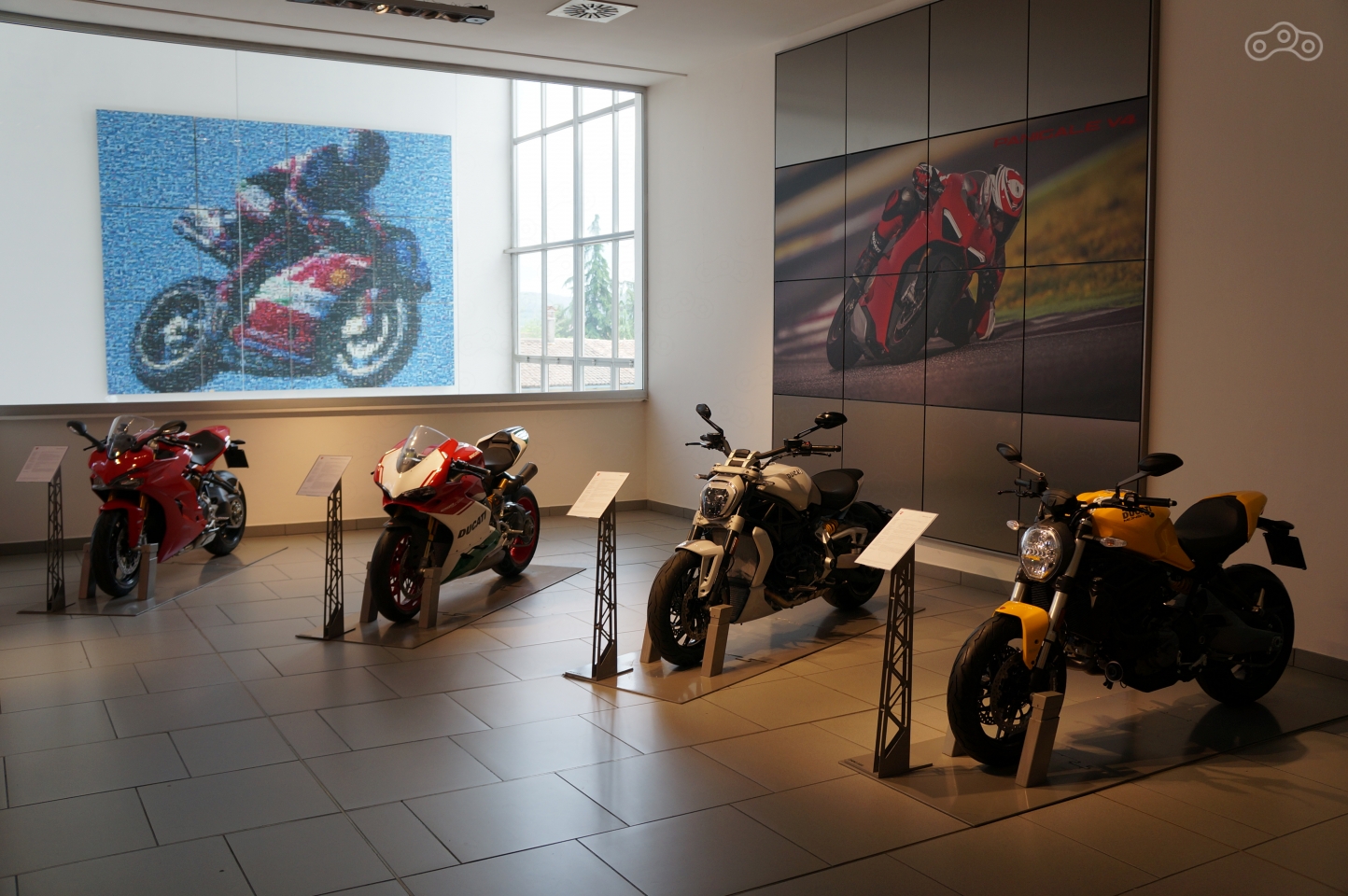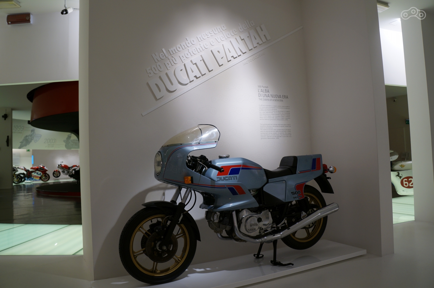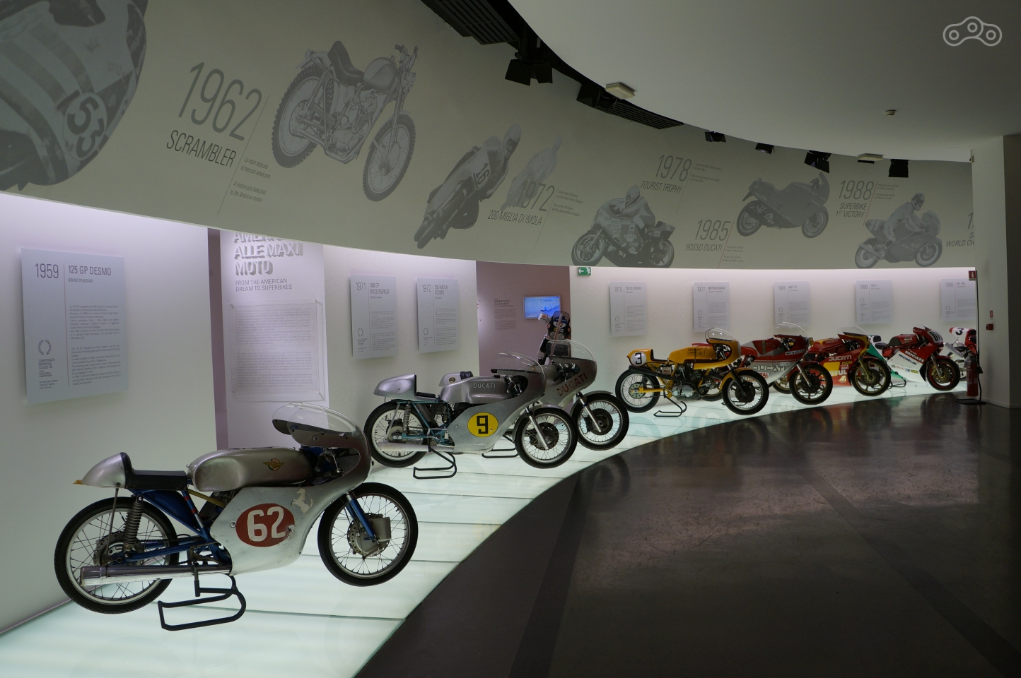 Помещение музея овальное, посетители ходят между залами с серийными моделями через полукруг гоночных мотоциклов бренда, расставленных в хронологическом порядке, от первых 125-кубовых аппаратов середины прошлого века до последних болидов Moto GP, завершающаяся стендом с кубками и трофеями разных лет.