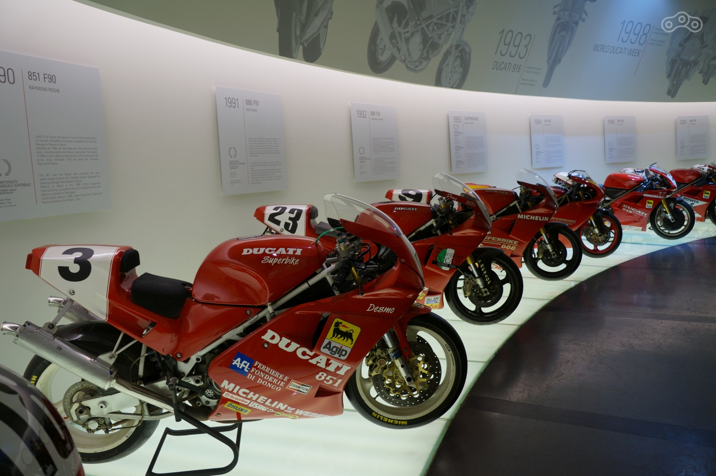 Именно ему посвящен следующий зал, в дальних углах которого представлена лимитированная серия Superlight культового Ducati Super Sport 1988 года и супербайк Ducati 851, мотор которого, впервые в истории компании, получил 4-клапанные головки и имя Desmoquatro.
