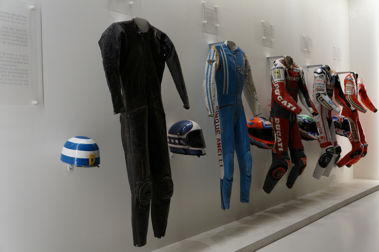 А немного поодаль – витрина с интереснейшей подборкой гоночной экипировки разных эпох, от первых кожаных комбинезонов, лишенных всякой защиты и шлема-половинки, до обмундирования, использующихся в кольцевых гонках сегодня. Конечно, не мотоциклы, но минут десять рассматривание молний и застежек разных лет отнимет, будьте готовы!