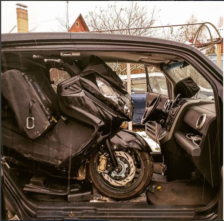 Пикааап Пикаап Фургоон .... .немного мотов по размерм больше чем здоровенные максискутеры. . ветровик пришлось снять в остальном - отлично влазит в Honda - element. кроссовер .