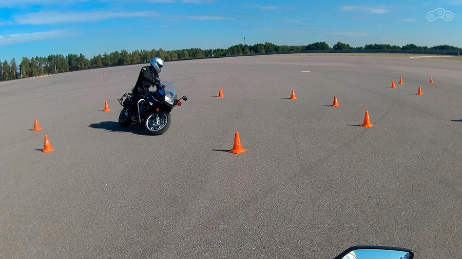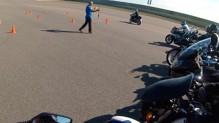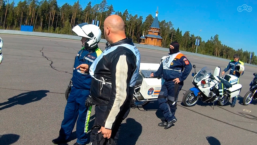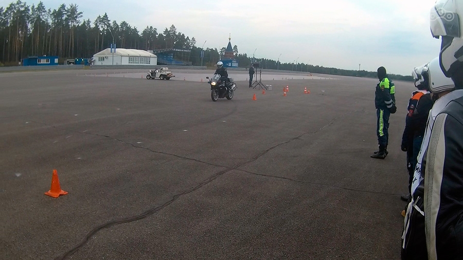 Инструктора отвечают на вопросы, после чего перемещаемся на площадку, где, опять же, сначала инструктор на мотоцикле снова показывает как проходить каждое упражнение, а только потом упражнение начинает выполнять группа, под внимательным контролем нескольких инструкторов.