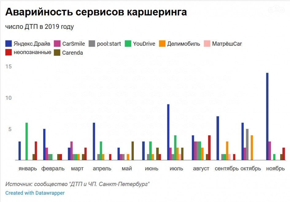 Статистику по аварийности автомобильного каршеринга в ГИБДД вести только начинают, нехотя выделяя ее из общей массы ДТП. А учитывая, что по словам самих каршеринговых сервисов, один прокатный автомобиль заменяет восемь личных, вообще не понятно, как соотносить аварии "шеринговых" машин с обычными.
