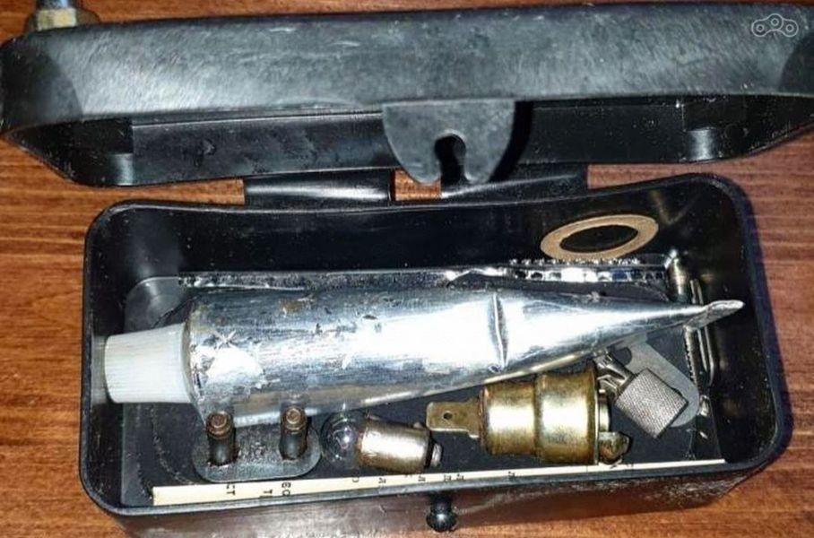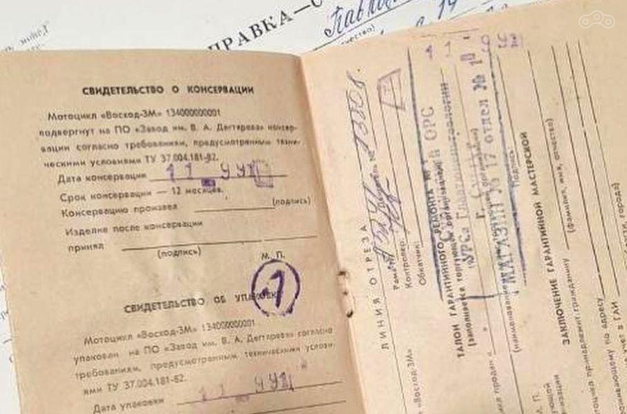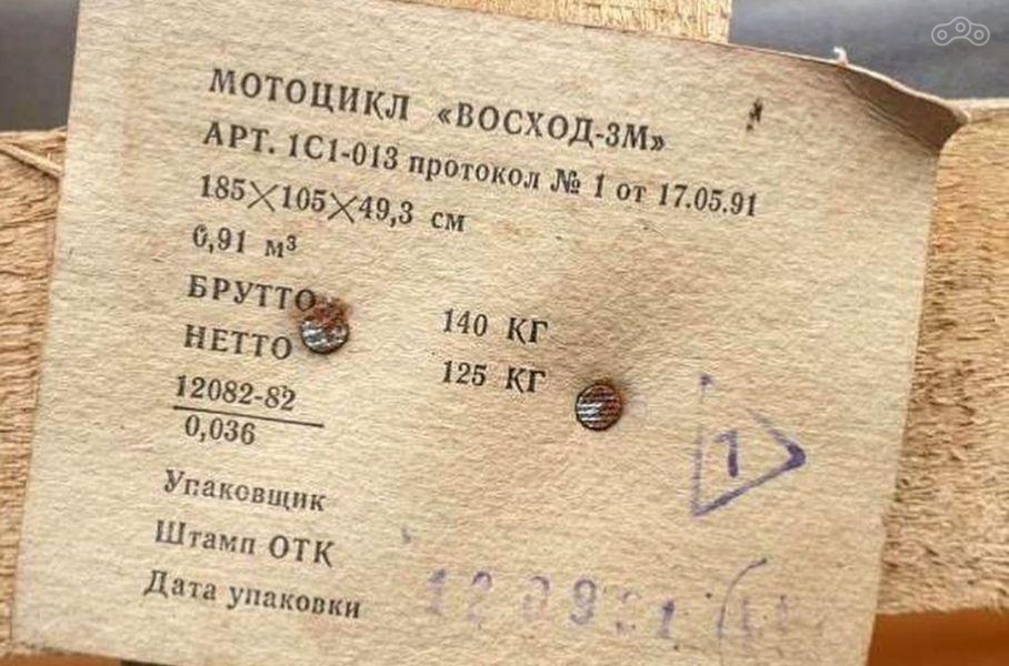 Судя по штампу на упаковке, мотоцикл простоял без движения 29 лет, с 1991 года. С полностью комплектным аппаратом жёлтого цвета было найдено заводское свидетельство о консервации, кожаная обложка с тиснением, штатные инструменты в чехле и набор для ремонта камер.