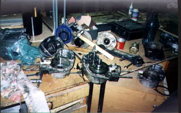 Это старый двигатель, еще от восхода 2м. Как раз в процессе извлечения коробки и колена, которое позже было поменяно на новое, хотя и становилось болтон. А рядом уже лежит совский картер с одним обломаным ухом, которое варилось аргоном и обрабатывалось на токарном станке, чтобы сформировать привалочную плоскость.