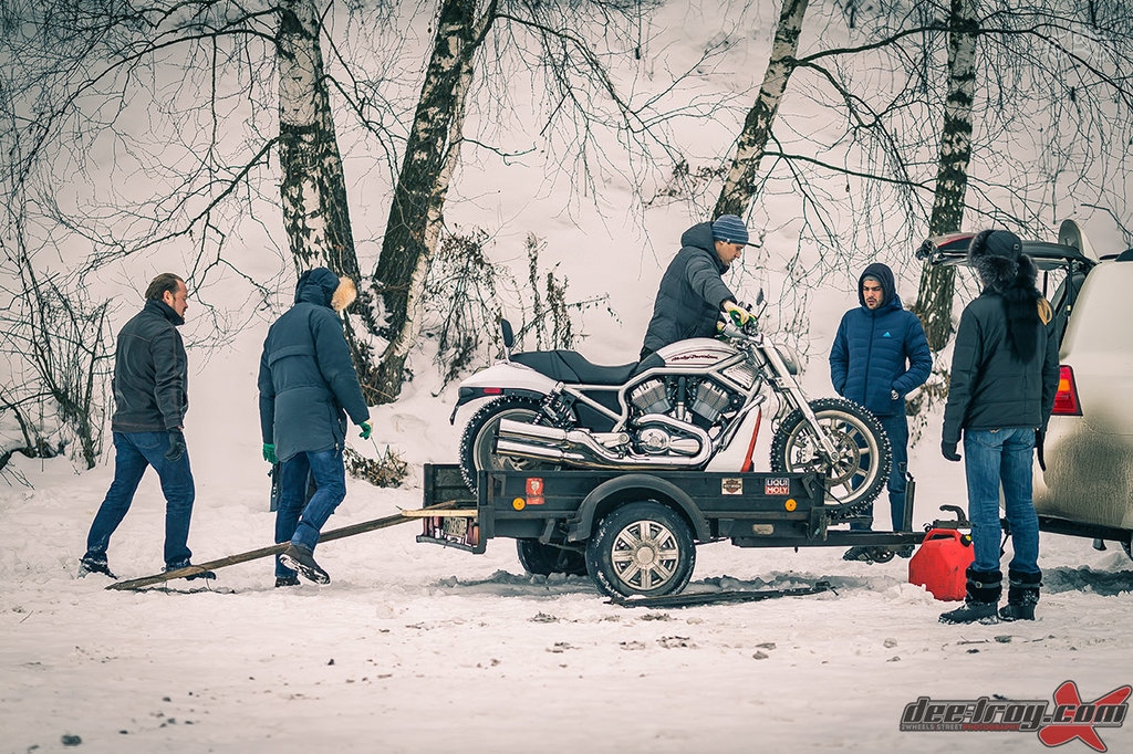 Место Ромыч выбрал на Новой Риге, неподалеку от МКАД, многие знают этот спуск к Москва-реке, зимой там часто дрифтят на тазах начинающие раллийщики. Туда в среду (ибо в выходные народу полно) и привезли на прицепе отшипованный ХД.