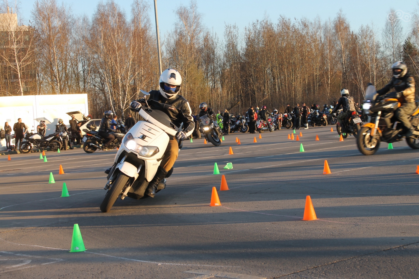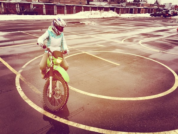 Занятия на площадке для меня начались, когда еще лежал снег (на мотоциклах установлена шипованная резина). Это особый опыт. Мне, впервые севшей за руль, было непросто управлять мотоциклом, да еще и на скользкой площадке, но я и не отдыхать пришла, а учиться и совершенствоваться. Не скажу, что все получалось сразу, но чем больше часов накатываешь, тем более послушным становится мотоцикл.