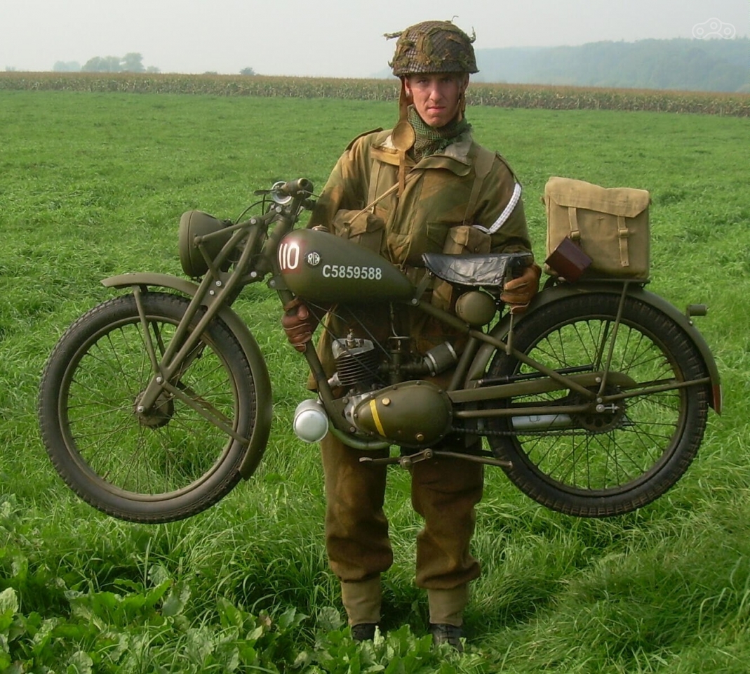 Напомним, легковесный 125-кубовый Royal Enfield WD/RE был спроектирован в конце тридцатых годов прошлого столетия по образу и подобию модели DKW RT100 и успешно пережил все тяготы Второй Мировой Войны. Как и многие действующие заводы тех лет, трудившиеся на благо нужд армии, Royal Enfield получал заказы от государства на разработку и производство доработанных для несения службы моделей. Увидев в лёгком мотоцикле потенциал для десантирования, власти дали задание спроектировать для «125-ки» специальную конструкцию, выдерживающую приземление мотоцикла с парашютом на землю. Несколько пробных экземпляров не выдержали тестовых испытаний, однако, после успешной модернизации, в 1942 году было запущено производство на заводе Calton Hill в Эдинбурге.