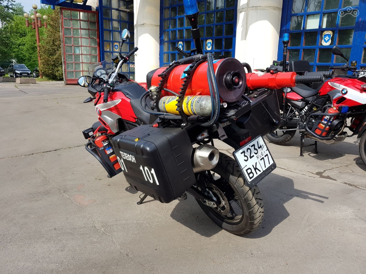 На днях в Москве состоялись показательные выступления пожарных на мотоциклах. Принявшие участие в мероприятии BMW F700GS были окрашены в красный цвет, укомплектованы огнетушителями, водяной пушкой с баллоном и рукавом и необходимыми средствами для оказания первой медицинской помощи. Кроме того, на мотоциклах, участвовавших в показательных выступлениях, была установлена светосигнальная аппаратура и инструментальный ящик.