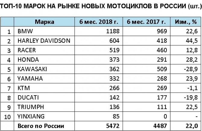 Топ-10 производителей, успешно реализовавших мототехнику в 2018 году по данным агентства «Автостат»