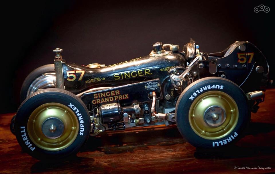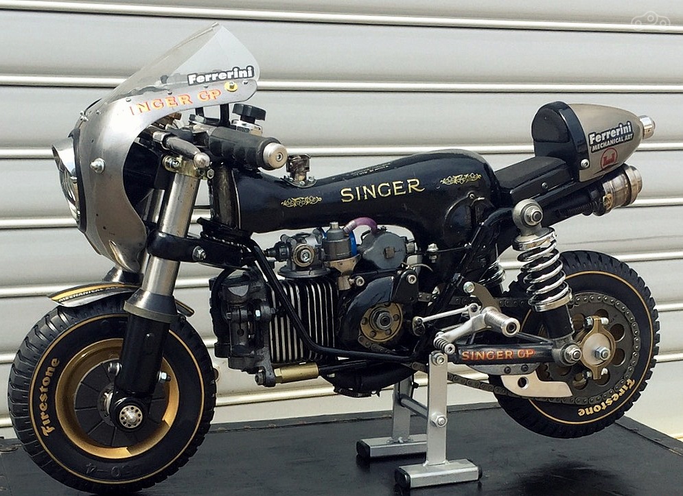 Джанлука Феррерини построил массу скульптур, в том числе с использованием швейной машинки Singer, но только минибайк Singer GP помещается в старинный чемодан и путешествует вместе с ним по всевозможным мероприятиям, оставляя массу положительных эмоций у обывателей.