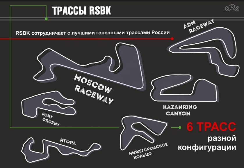 В новом сезоне расширится география чемпионата! RSBK пройдет на 6 лучших трассах страны. Впервые мотоциклетные соревнования примут трассы Санкт-Петербурга («Игора Драйв») и Грозного («Крепость Грозная»).