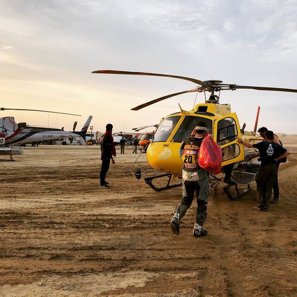 Аккумулятор быстро разрядился, я вызвал машину организаторов. Подключили провода, чтобы «прикурить», я очень долго крутил стартер, в итоге мотоцикл завелся, я поехал дальше. Проехал 40 километров, и мотоцикл снова заглох. Попросил местных толкнуть, проехал ещё 5-7 километров и уже окончательно сошел. Прилетел вертолет и забрал меня.