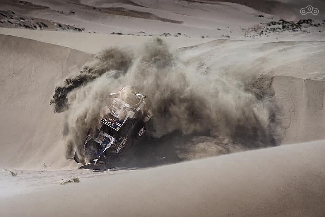 Очень жаль Сергея Карякина, он реально претендовал на подиум, хороший гонщик, быстро и аккуратно едет. Но досадное падение с дюны и все, шансы на призовые места улетучились. Сергей говорил, что в легенде этого трамплина не было, просто в какой-то момент земли под колесами не стало, а потом удар.