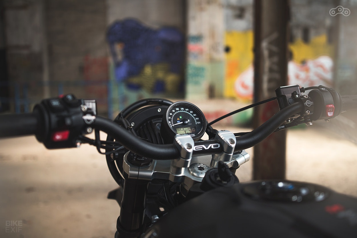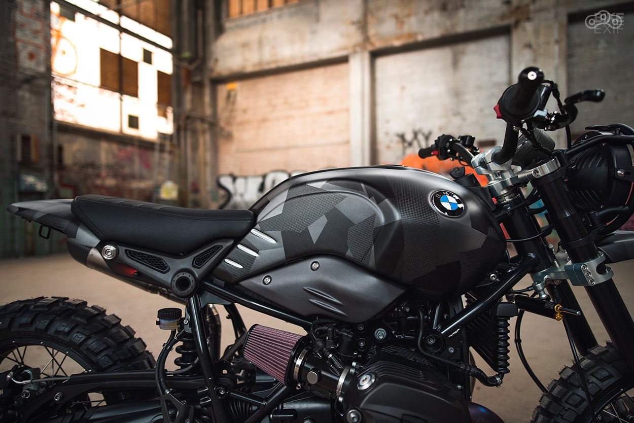 Также были изготовлены новая 7-дюймовая светодиодная фара, кастомные траверсы, титановый выхлоп SC-Project, а также хвост с сидением, установлен кроссовый руль Pro Taper, небольшой спидометр, а в финале британские мастера Image Design Custom покрасили байк в камуфляж и покрыли износостойким лаком.