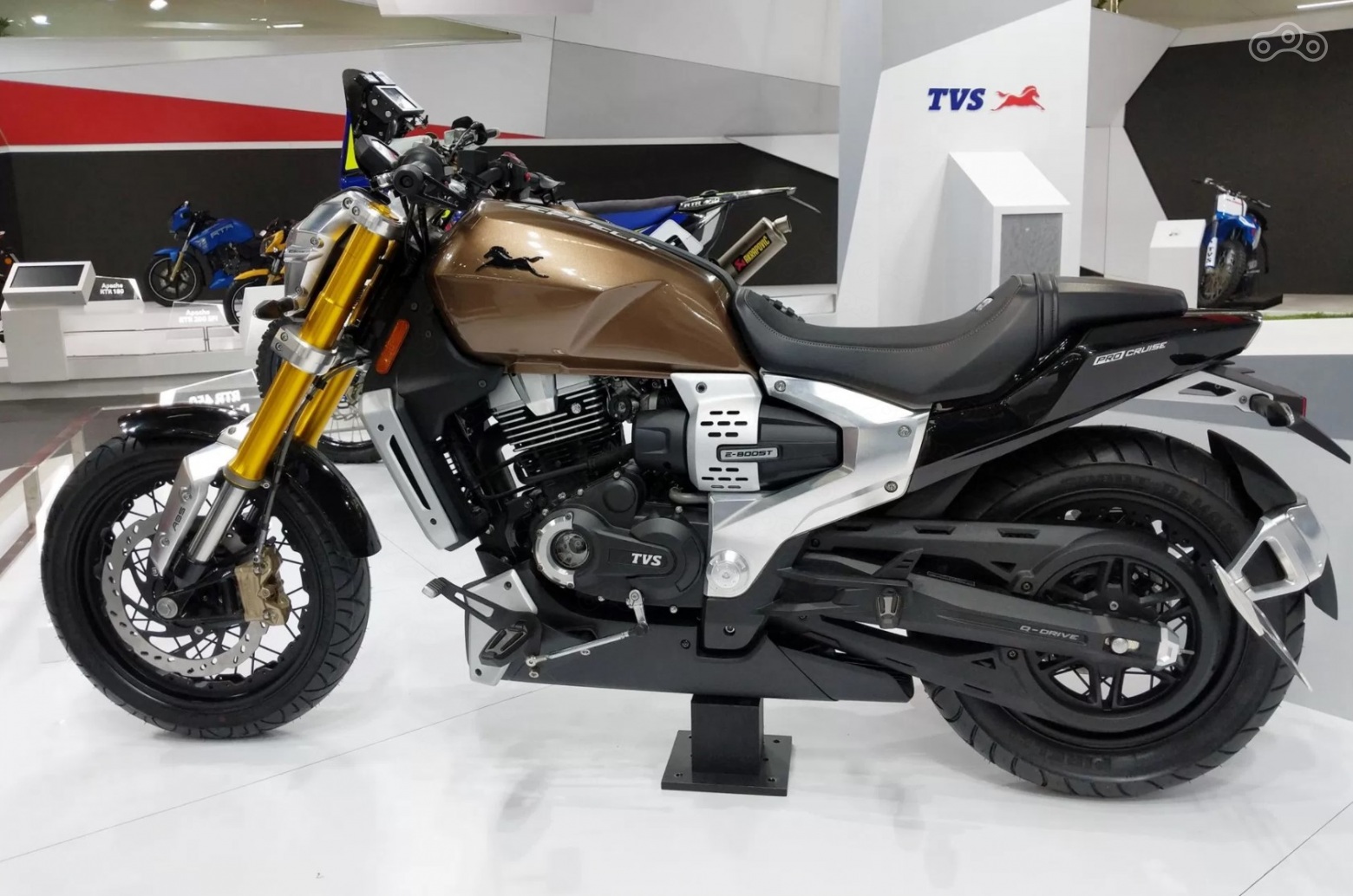 Несмотря на скромную кубатуру двигателя, TVS Zeppelin — настоящий круизёр с длинной базой и вынесенными вперёд водительскими подножками. Его главными «фишками» является светодиодная фара со встроенной экшн-камерой и дополнительный 1,6-сильный электромотор, который улучшит динамику при разгоне и уменьшит потребление топлива. Хотя основной 220-кубовый одноцилиндровый двигатель внутреннего сгорания с 20 л. с. и 18,5 Н-м и так должен отличаться крайне скромным аппетитом.