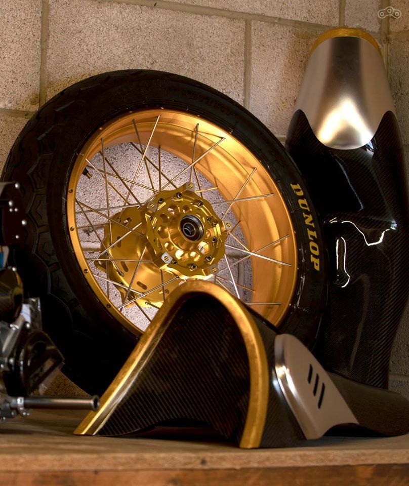 За торможение отвечают 320-миллиметровые тормозные диски (сзади установлен диск диаметром 265 мм) и радиальные скобы HEL. Спицованные колёса обуты в покрышки Dunlop Classic TT100 GP Radial размерностью 120/70-17 спереди и 150/60-17 сзади.