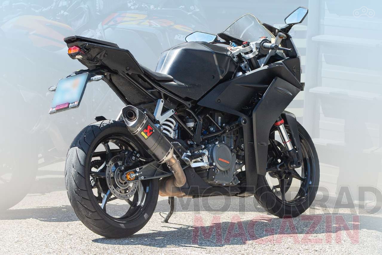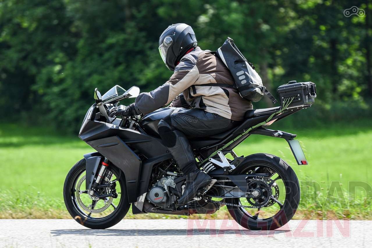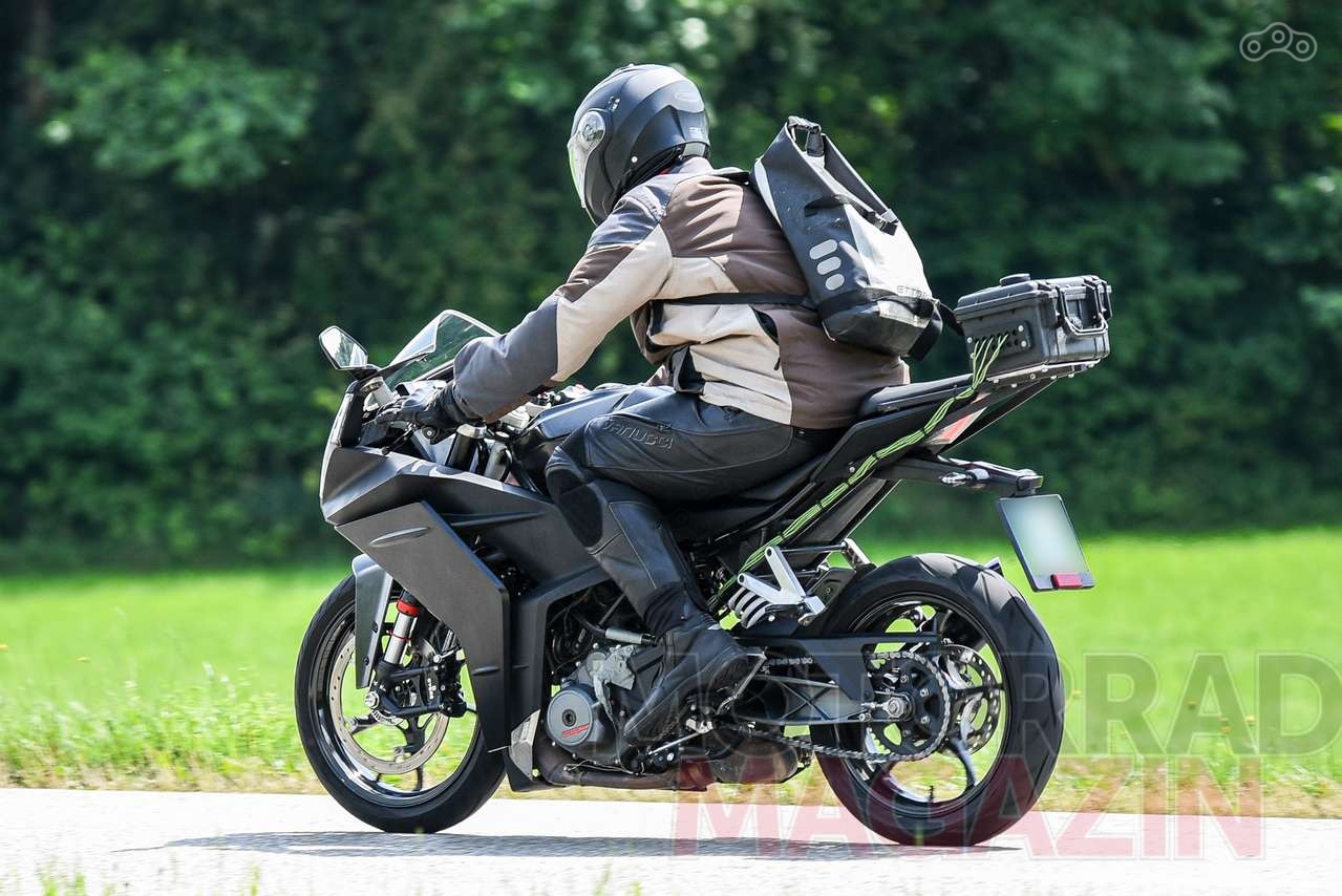 На фотографиях видно новое ветровое стекло иной формы, которое стало массивнее и закрывает теперь обе светодиодные фары мотоцикла с дневными ходовыми огнями. Боковой пластик стал более массивным и угловатым, он позволяет австрийскому спортбайку выглядеть немного солиднее своей скромной кубатуры, его дизайн немного напоминает теперь KTM RC8. Скорее всего новая облицовка обеспечит улучшенную ветрозащиту.