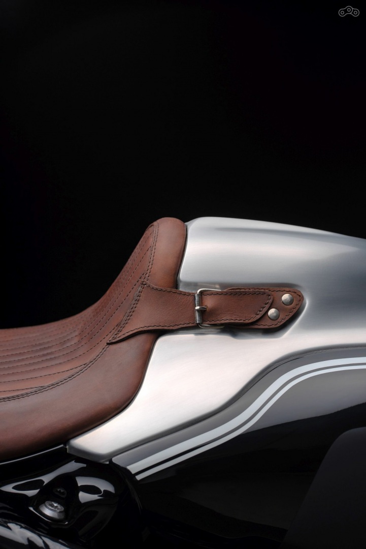 Но если Сэндс построил мотоцикл в дрэгстерном стиле с жёсткой задней подвеской, жирным задним сликом, клипонами и передней вилкой от S1000RR, то Науманн выбрал стилистику каферейсера. BMW Blechmann R 18 получил изготовленный вручную спортивный полуобтекатель, установка которого потребовала модификации топливного бака, простроченное одноместное седло из коричневой кожи и двухцветную чёрно-серебристую окраску с белыми цировками в стиле BMW R32 1923 года.