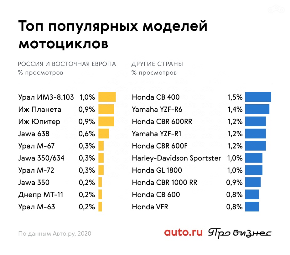 Статистика анализировалась отдельно по отечественным мотоциклам и отдельно по «иномаркам». Чаще всего посетители сайта искали информацию об «Урале» ИМЗ 8.103-10, второе и третье места в категории «советский мотоцикл» — у Иж Планета и Иж Юпитер, соответственно. На эти три модели пришлось три процента траффика мотоциклетного раздела auto.ru за девять месяцев, а десять самых популярных советских мотоциклов получили пять процентов от общего количества просмотров.