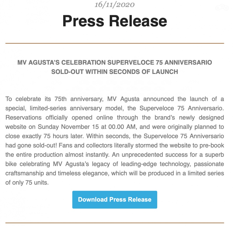 Продажа MV Agusta Superveloce 75 Anniversario началась в полночь 15 ноября, его можно зарезервировать за 100 евро, а полная стоимость мотоцикла составляет 25 тысяч евро.