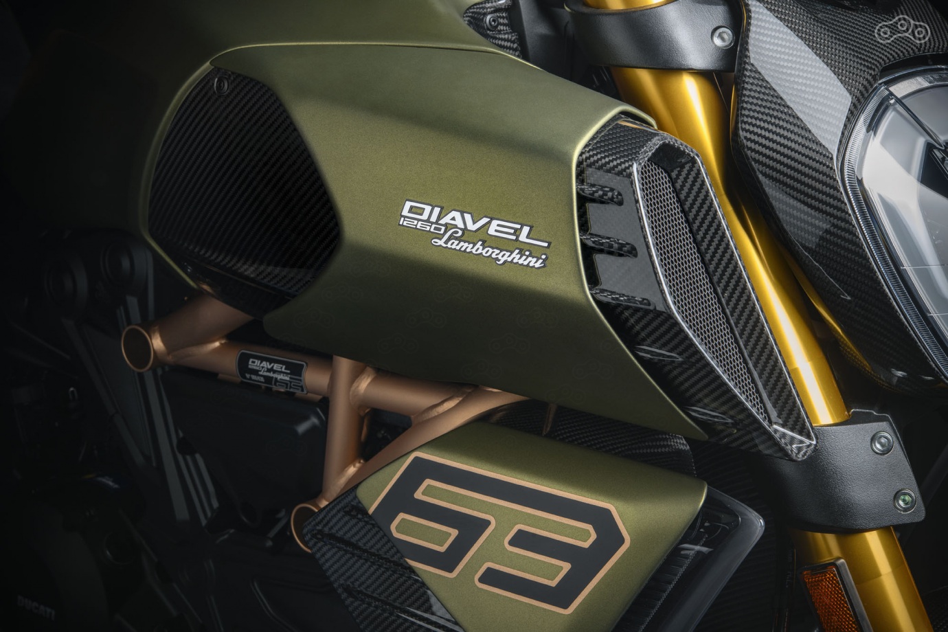Помимо индивидуального номера на раме каждый новый итальянский пауэр-круизёр получит оливковую окраску с бронзово-золотистыми деталями. Y-образные фары суперкара были обыграны на тиснении покрытия седла, шестигранные глушители двухколёсного Lamborghini напоминают выхлоп четырёхколёсного «родственника», а на его боковой пластик нанесена цифра 63.