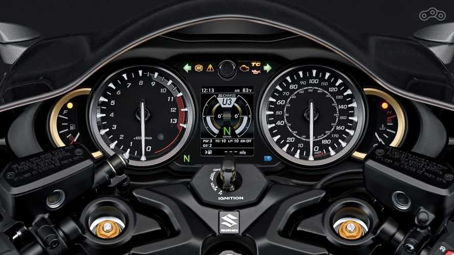 Как уже было продемонстрировано в ролике-презентации, центральная часть приборной панели нового GSX1300R стала полноцветной, она отображает угол крена мотоцикла, режим электронной ручки газа, номер включённой передачи и информацию о настройке электронных помощников.