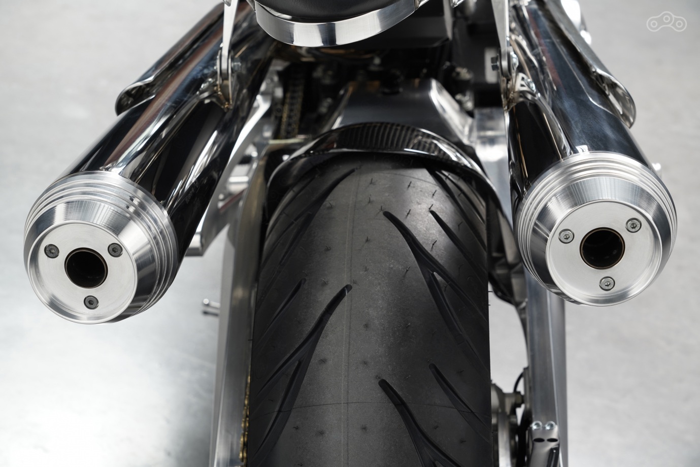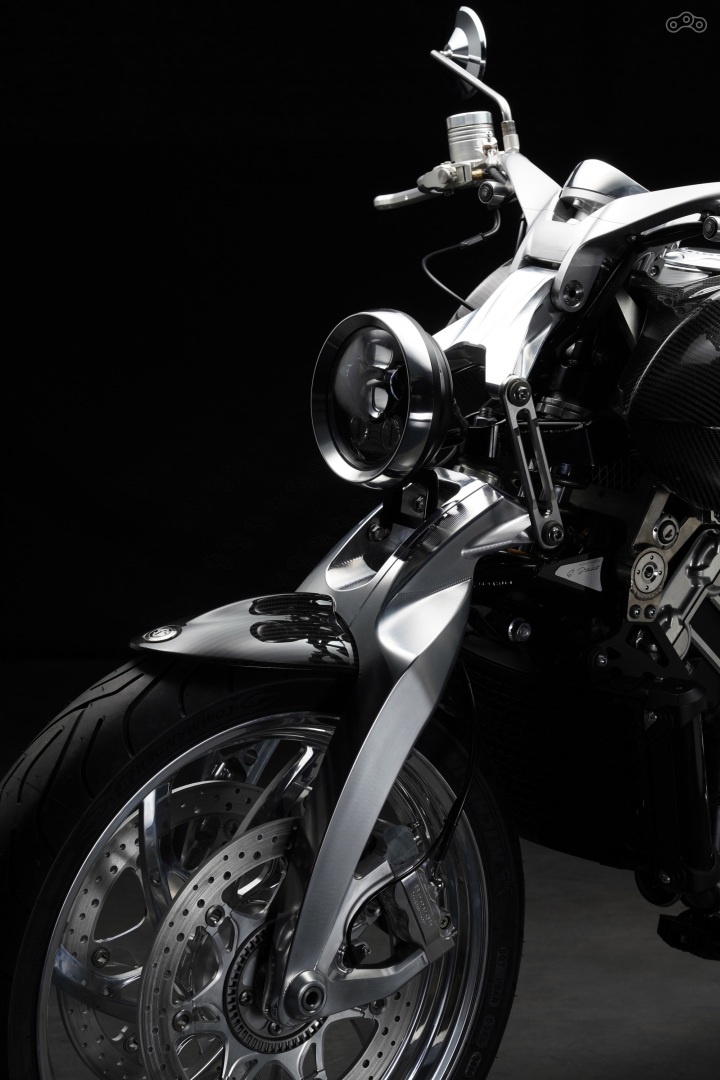 19- и 17-дюймовые семиспицевые колёсные диски обуты в покрышки 120/70-19 и 200/55-17 и тоже выточены на фрезерном станке. Страшно подумать, сколько металлической стружки остаётся после изготовления Lawrence. Впрочем, тотальное использование лёгких материалов дало свои плоды: мотоцикл весит всего 200 килограммов.