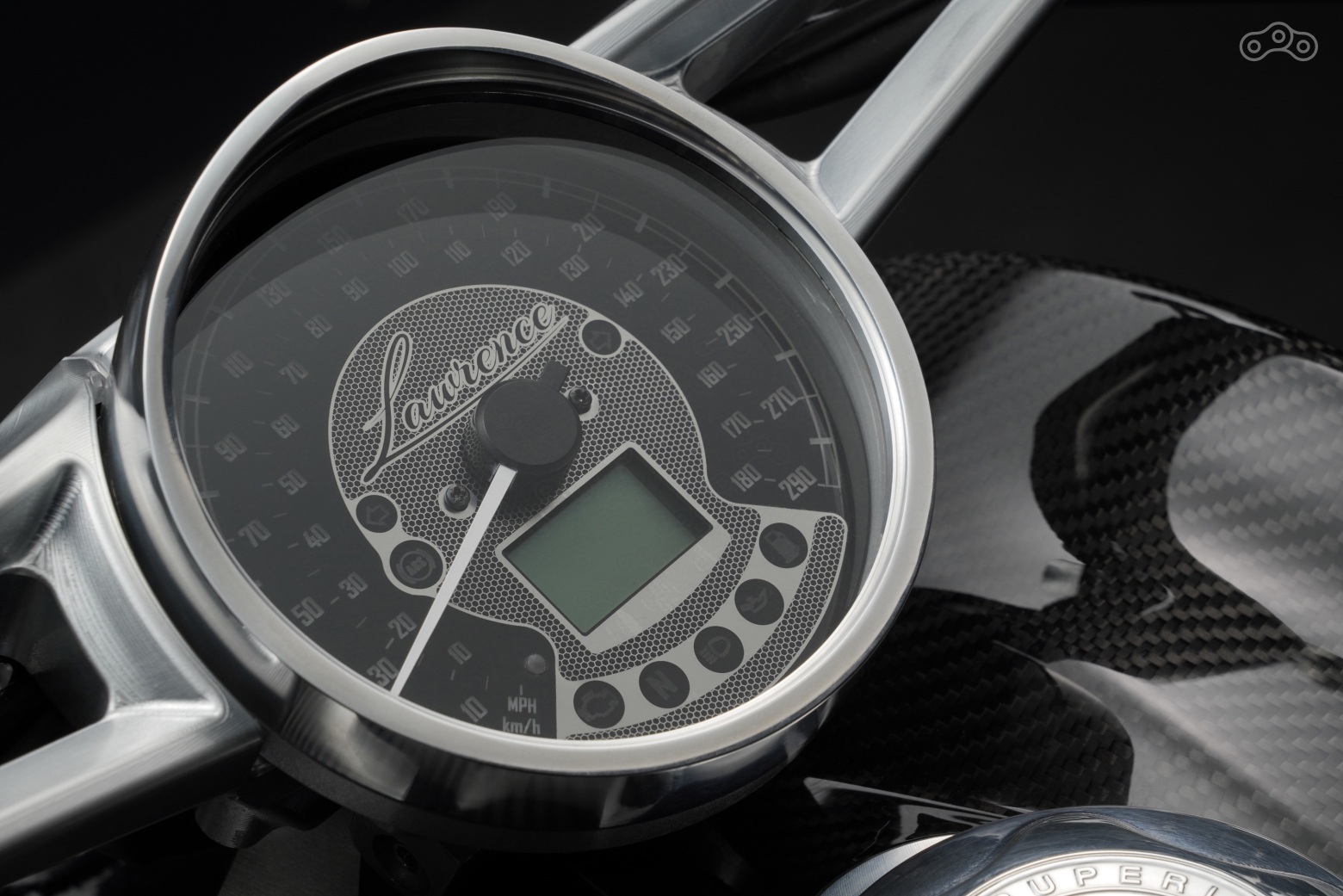 Дизайнеры Brough Superior впервые решили отказаться от классической стилистики, предыдущие модели практически полностью повторяли облик старинных мотоциклов этого английского бренда. Однако не этот раз: крылья, хвост и 17-литровый топливный бак Lawrence изготовлены из углепластика, а дизайн аналогово-цифровой панели приборов тоже обыгрывает карбоновую тему.