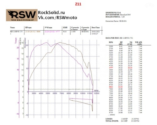 Максимальная мощность Z11 (включая потери на трансмиссию и на внедорожные колеса) достигла 27 лс при 6900 об / мин. Мощность в точности повторяет данные от завода производителя.