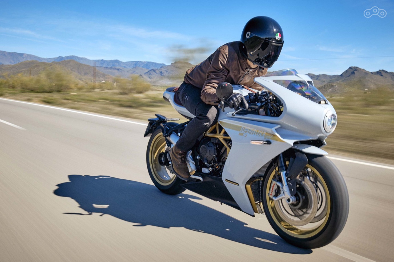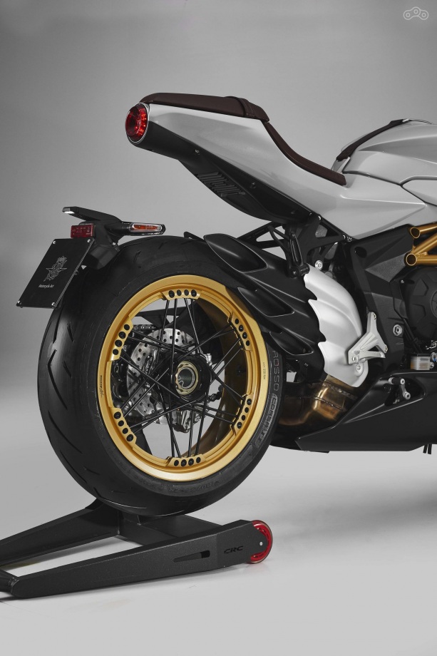 Что касается модификации MV Agusta Superveloce S, то её отличает жемчужно-белый цвет, бескамерные спицованные колёса и седло из коричневой алькантары. Для S доступен гоночный набор, включающий крышку пассажирского седла, асимметричную выхлопную систему Arrow и настроенный для трека блок управления двигателем.