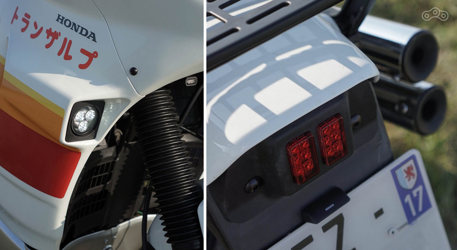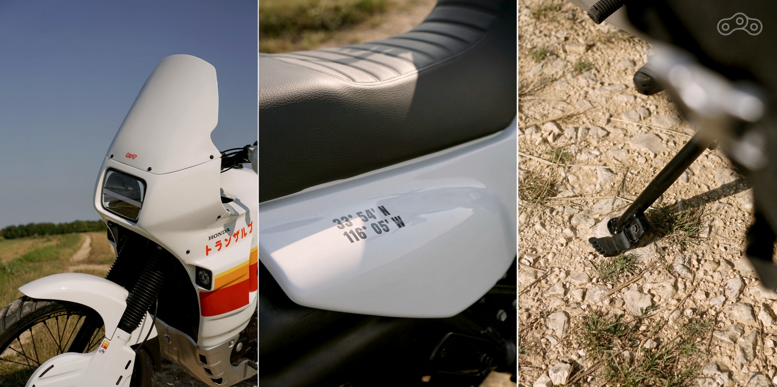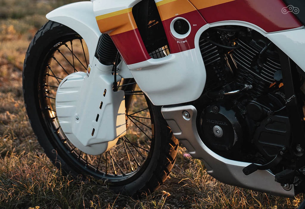 Первым делом Янн подобрал живого донора. Мотоцикл был разобран до винтика, рама отпескоструена и окрашена, а двигатель полностью перебран. Ключевым апгрейдом двигателя стала установка программируемого микропроцессорного зажигания DevMoto. Также была заменена ведущая звезда на усиленную. Переднюю 41-миллиметровую вилку Showa было решено не трогать, а вот место стокового заднего амортизатора занял новый аморт от EMC c кастомной защитой от грязи. Также мотоцикл обзавелся тормозной системой Brembo и встал на обода Excel с резиной Avon TrekRider. Передний тормозной диск защитили олдскульной накладкой от UFO. С задним решили не возиться и оставили барабан.
