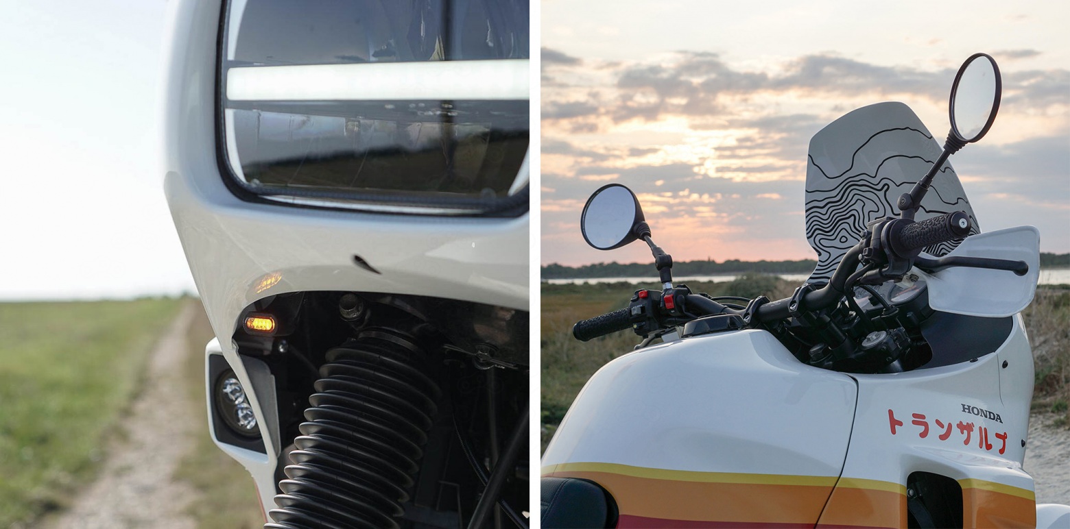 Элегантности экстерьеру придала окраска пластика в перламутровый белый цвет с добавлением ярких акцентов - наклеек с надписями на японском языке и полос закатных оттенков, что в ателье Viba прозвали “Japanifornia” (японская Калифорния). В целом у французов получился чистый, лаконичный и приятный ретро-футуристический проект без излишеств, готовый к реальным приключениям.
